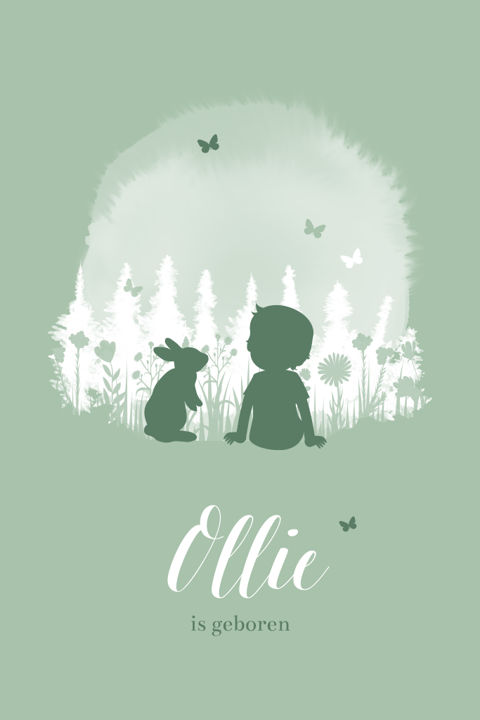 Verwacht jij een zoontje deze lente? Verstuur dit lieve, groene geboortekaartje met silhouet jongetje en konijntje om zijn komst aan te kondigen! De jongen en het konijn zitten in een bloemenveld, omringd door vlindertjes. Liever een ander lettertype of de kleur aanpassen? Geef je eigen draai aan dit kaartje met onze editor.