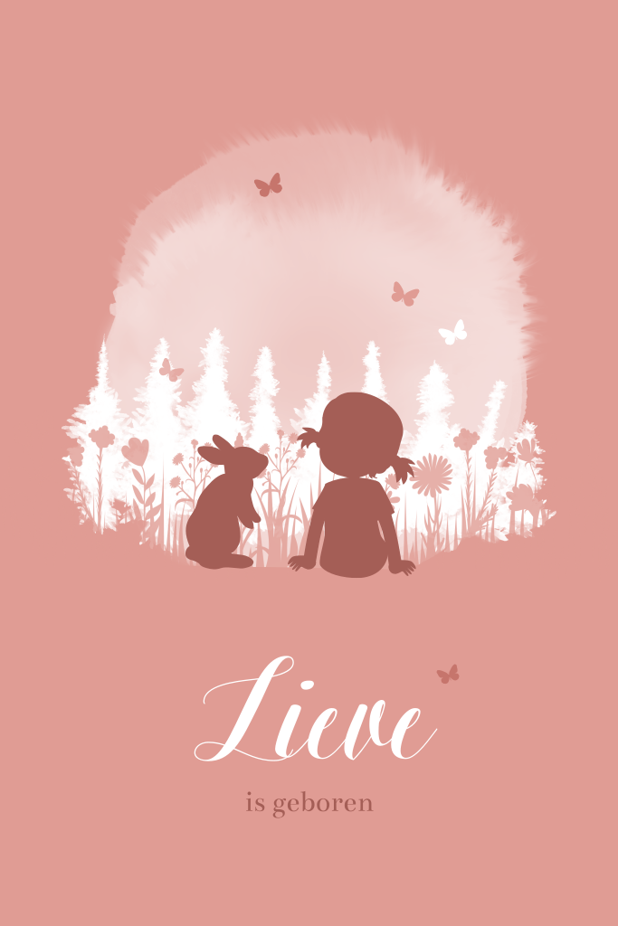 Verwacht jij een dochtertje deze lente? Verstuur dit lieve, roze geboortekaartje met silhouet meisje en konijntje om haar komst aan te kondigen! Het meisje en het konijn zitten in een bloemenveld, omringd door vlindertjes. Liever een ander lettertype of de kleur aanpassen? Geef je eigen draai aan dit kaartje met onze editor.