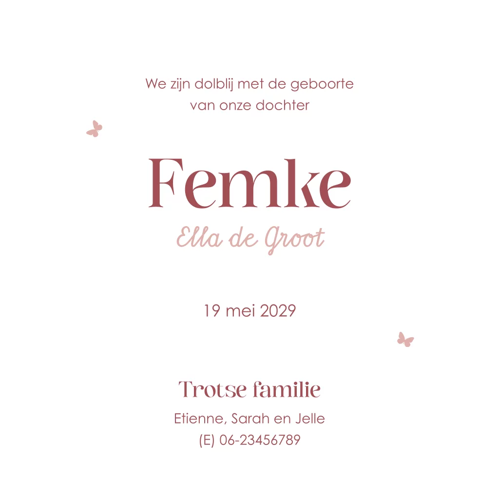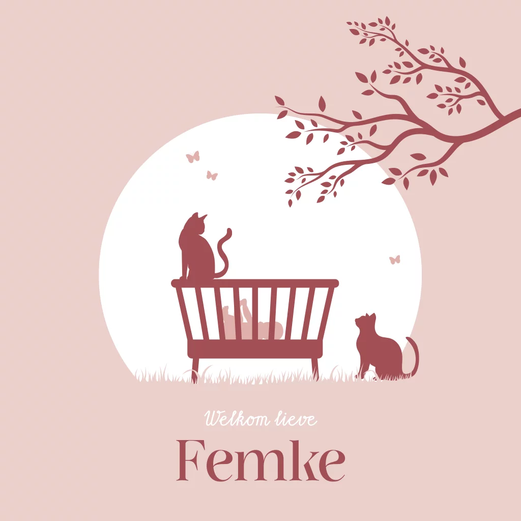 Roze silhouet geboortekaartje om de geboorte van jullie dochter, aan te kondigen. In het gras onder een boom staat een wiegje met twee nieuwsgierige katjes erbij. Pas het geboortekaartje naar eigen inzicht aan in de editor.