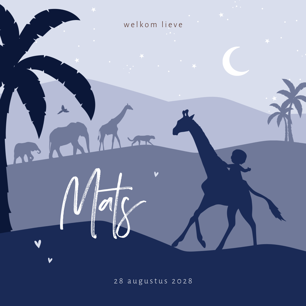 Silhouet geboortekaartje jongen met blauw landschap en safari dieren