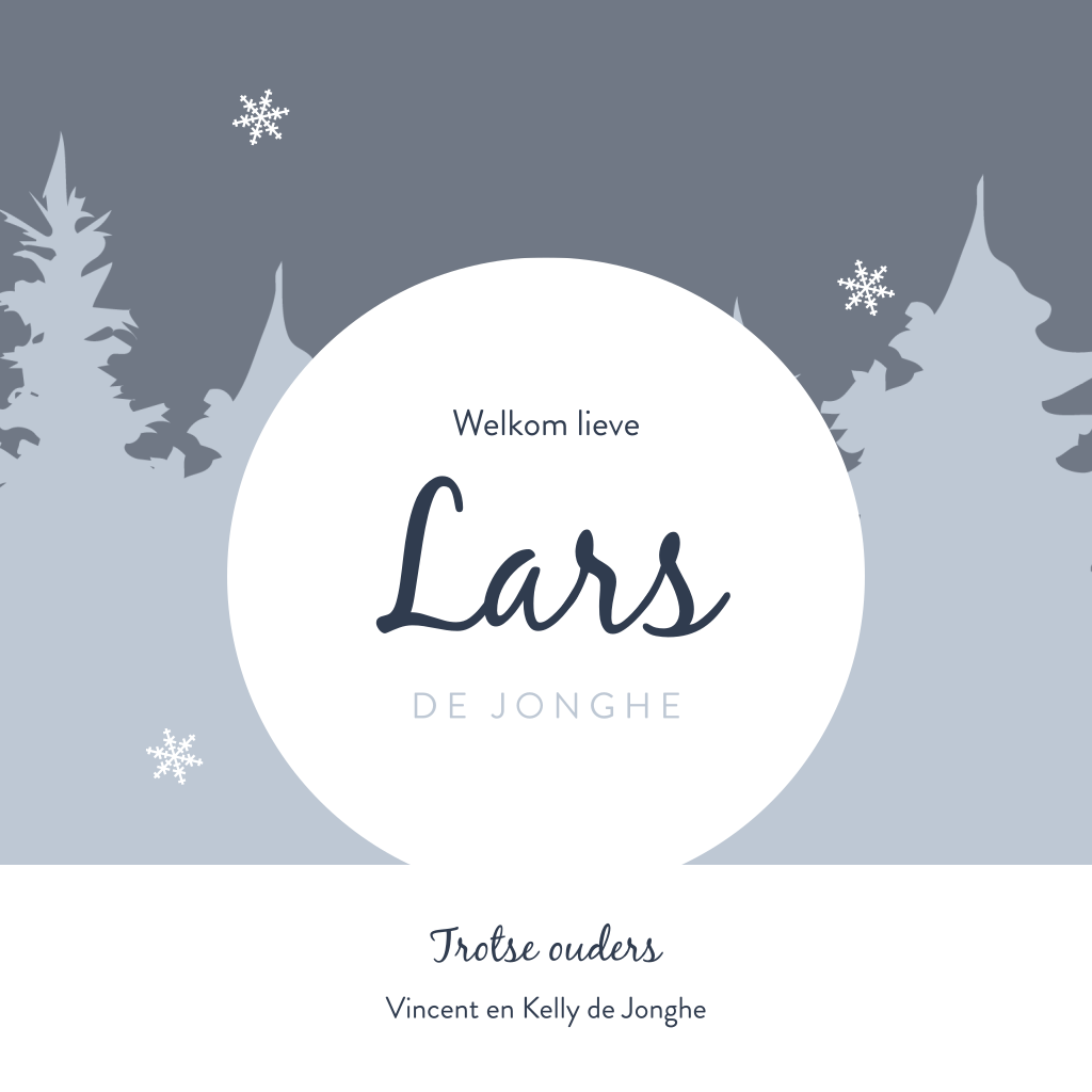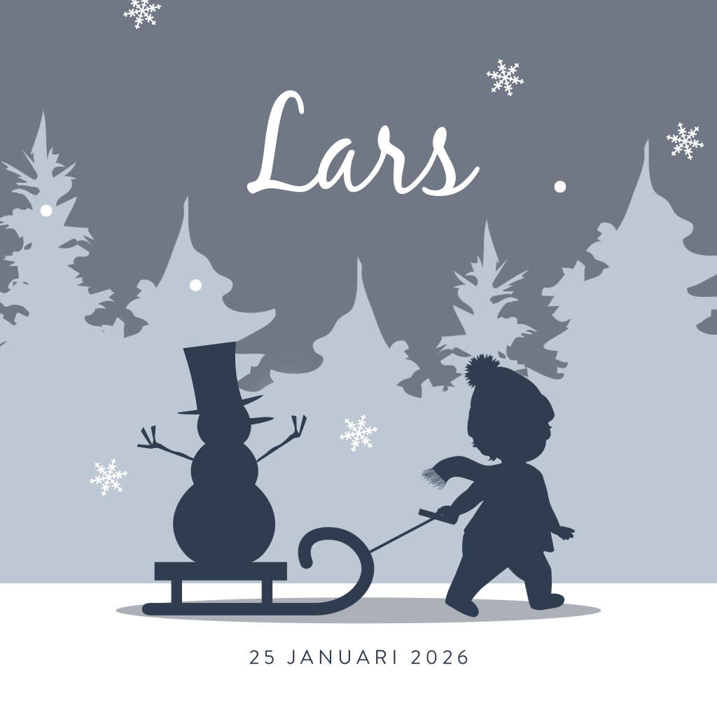 Silhouet geboortekaartje met jongetje en slee in de winter. Op zoek naar een bijpassend geboortekaartje voor de winter? Stop met zoeken, want dit lieve kaartje past daar perfect bij! Het vierkante ontwerp heeft een donkerblauwe achtergrond met een lichtblauw bos. Voorop loopt een jongetje met een slee en een sneeuwpop erop. In de kaart keert het jongetje terug, spelend met sneeuw. Pas de kaart naar wens aan en bestel een drukproef.
