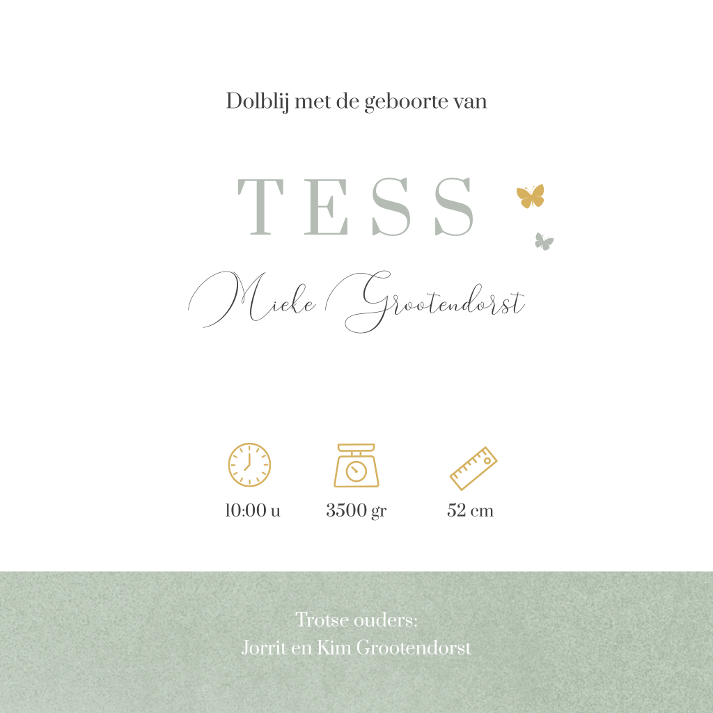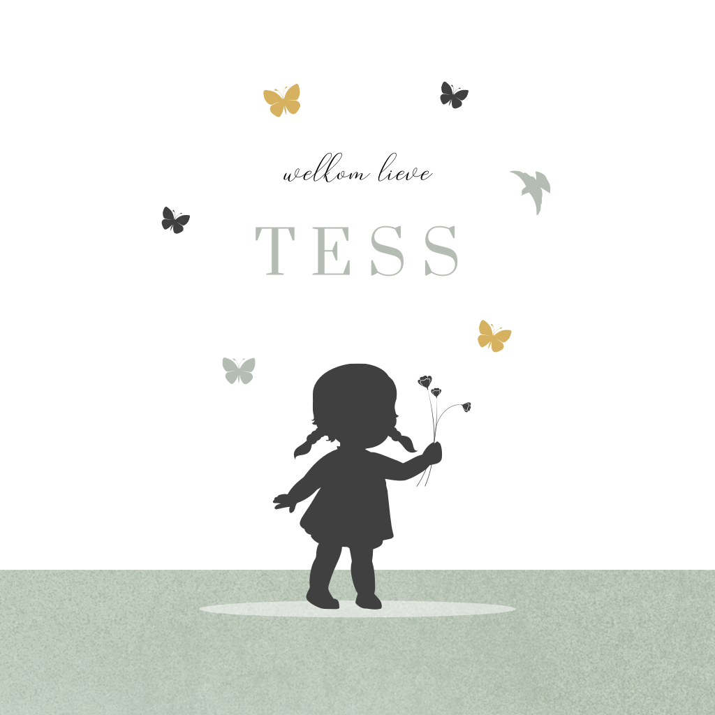 Silhouet geboortekaartje met lief meisje en groene vlinders en vogels. Klassiek geboortekaartje met stijlvolle uitstraling. Voorop staat een lief silhouetje van een klein meisje met bloemen in haar handen. Het geboortekaartje wordt rijkelijk versierd door gekleurde vlinders en een vogeltje. Met stijlvolle lettertypes staat de naam van je kindje voorop. In de kaart is ruimte voor een mooie quote en de geboortegegevens. Pas het ontwerp naar wens aan en bestel een drukproef.