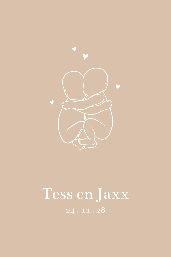 Een lief en trendy geboortekaartje in beige met minimalistische lijntekening van een tweeling. De naam van je kindjes komen in goudfolie voorop, ook de hartjes worden in glimmend goud gedrukt. Aan de binnenzijde is ruimte voor een mooi gedichtje en de geboortegegevens.