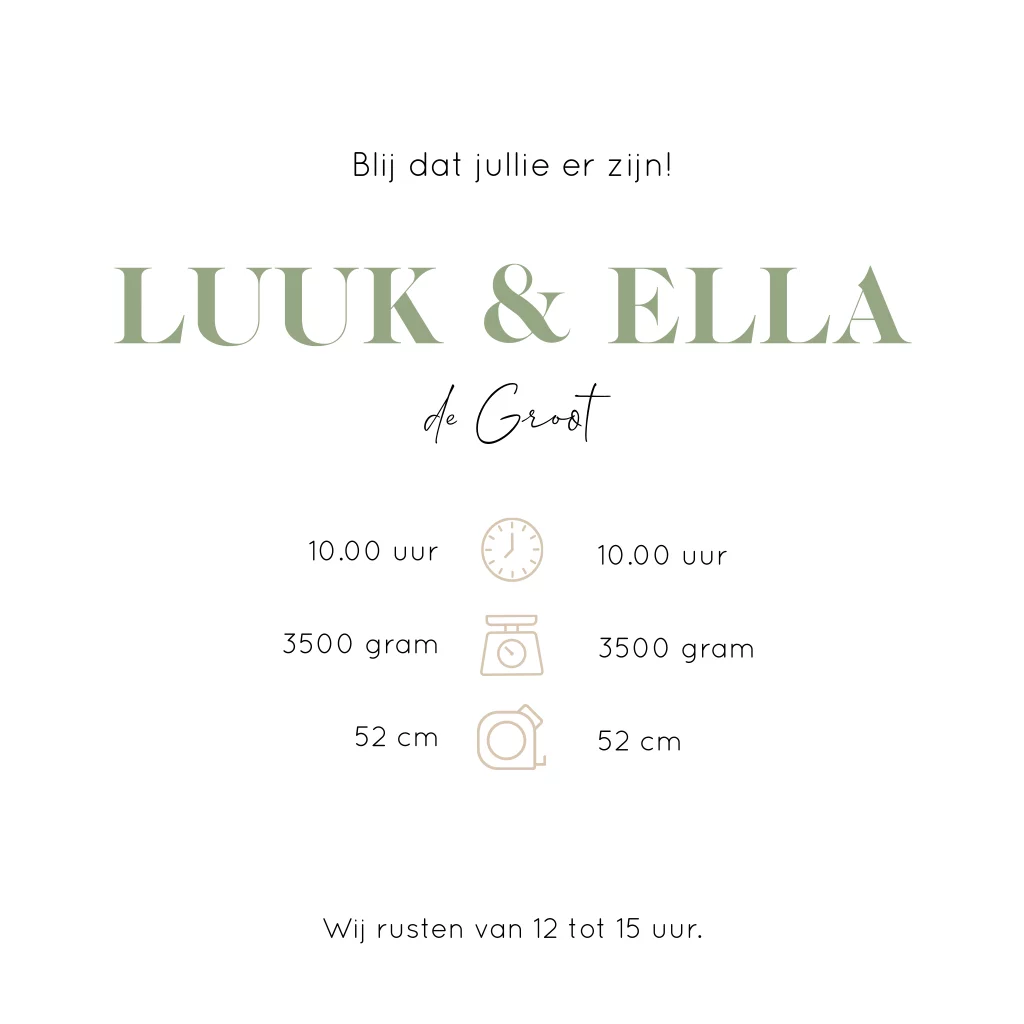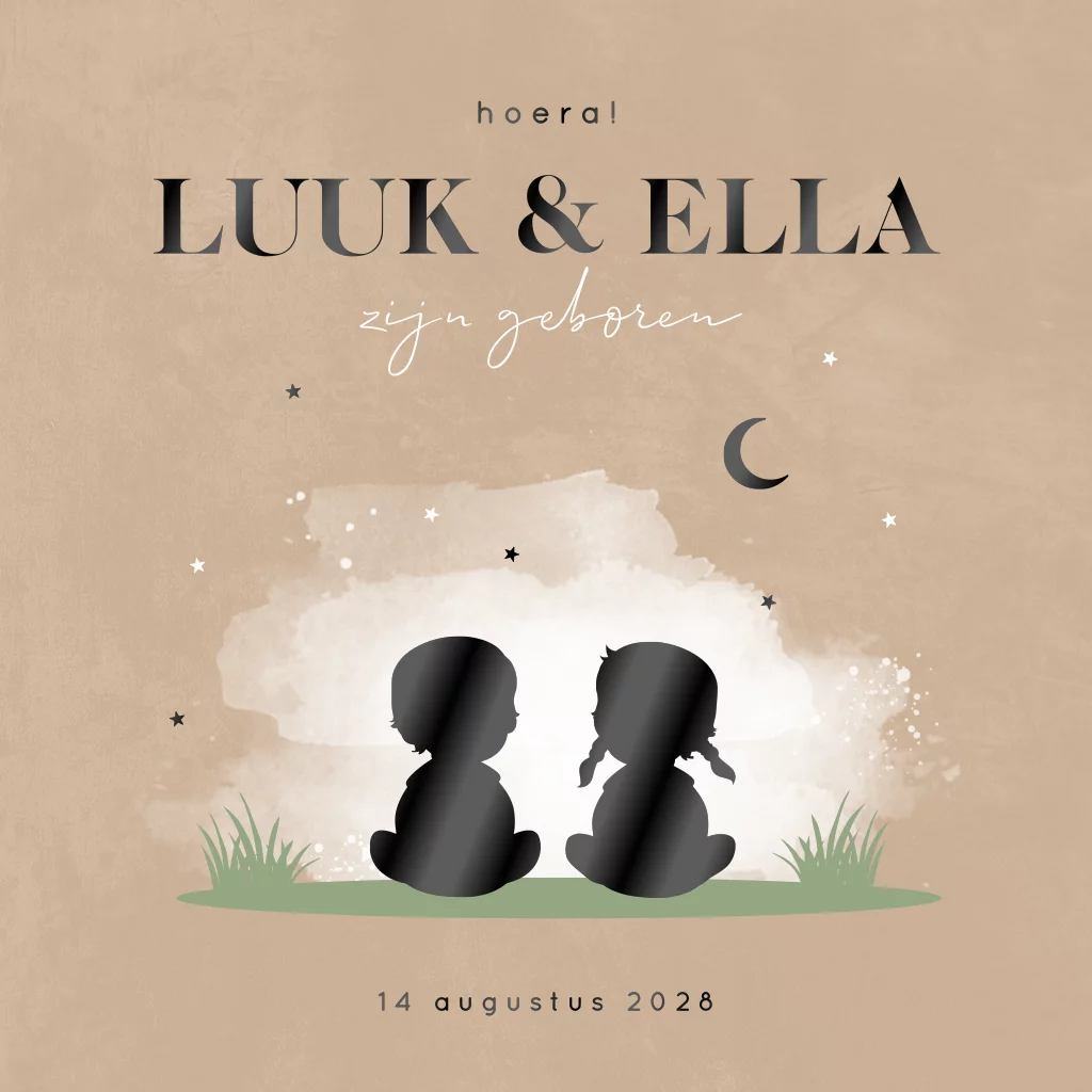 Ontdek dit schattige geboortekaartje voor jullie tweeling, uitgevoerd in zachte zandtinten met zwarte silhouetjes. Het kaartje is gemakkelijk aan te passen met onze gebruiksvriendelijke tool, zodat het helemaal naar wens wordt. Aan de binnenkant is er volop ruimte voor een lief gedichtje, een mooie quote, en natuurlijk de geboortegegevens van jullie zoon en dochter. Zo maak je het kaartje persoonlijk en helemaal uniek!