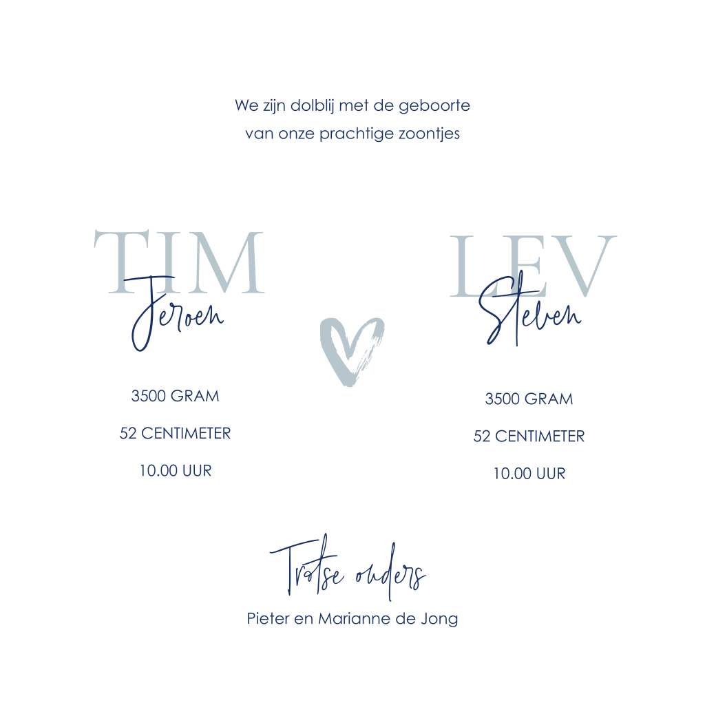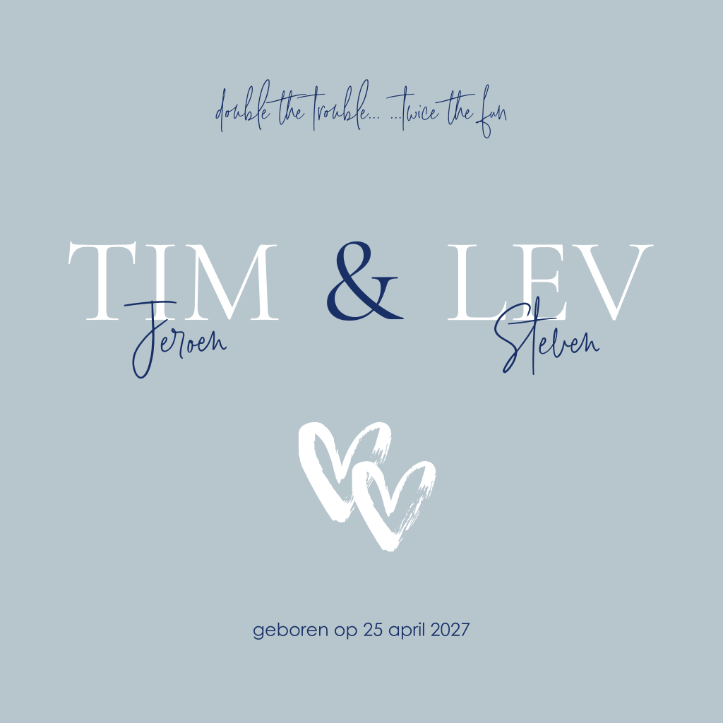 Twee broertjes op één geboortekaartje, bijzonder toch? Dit blauwe kaartje is perfect om jouw tweeling mee aan te kondigen! De voorkant is eenvoudig opgemaakt met de focus op de namen van je zoontjes, met daaronder twee witte hartjes. Aan de binnenkant van dit vierkante kaartje kun je een grote foto plaatsen van de twee jongens. Ook is er ruimte voor hun geboortegegevens. Op de achterkant kun je je eigen contactgegevens plaatsen.