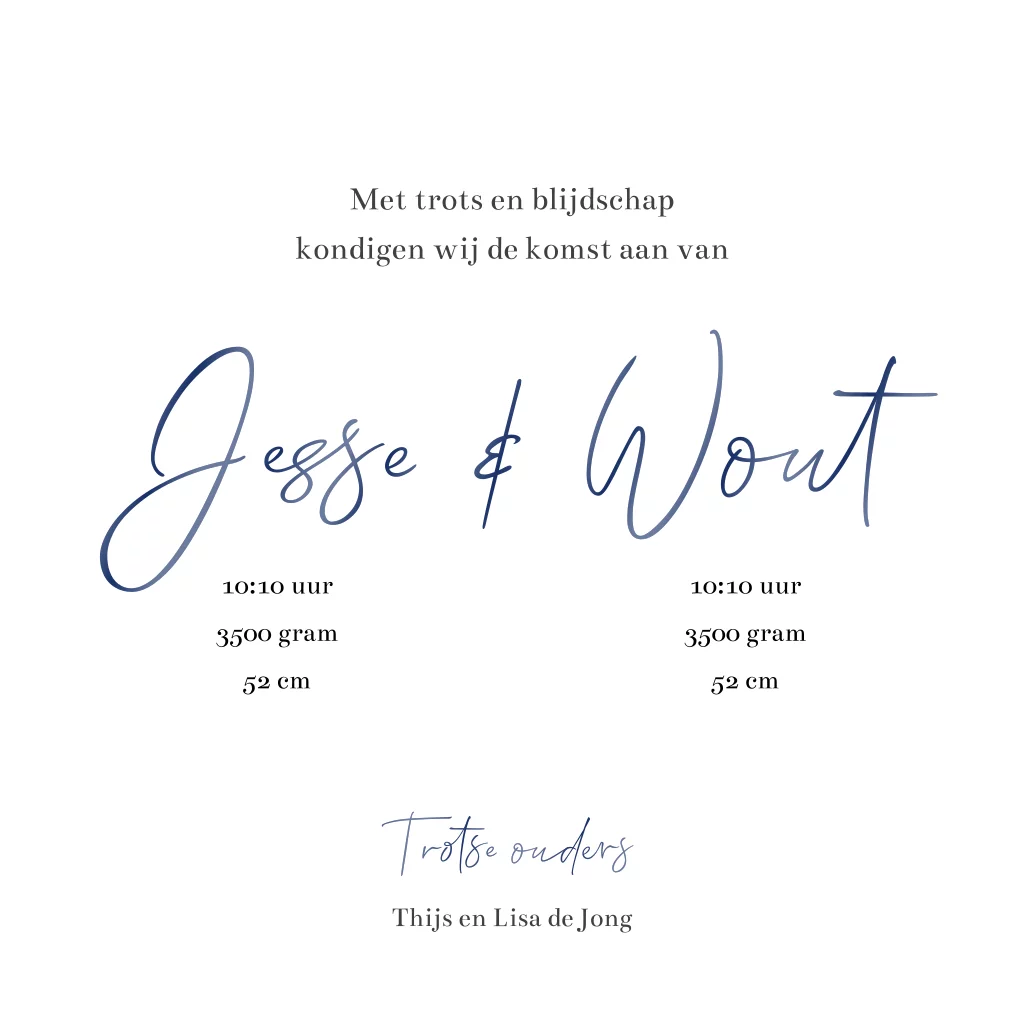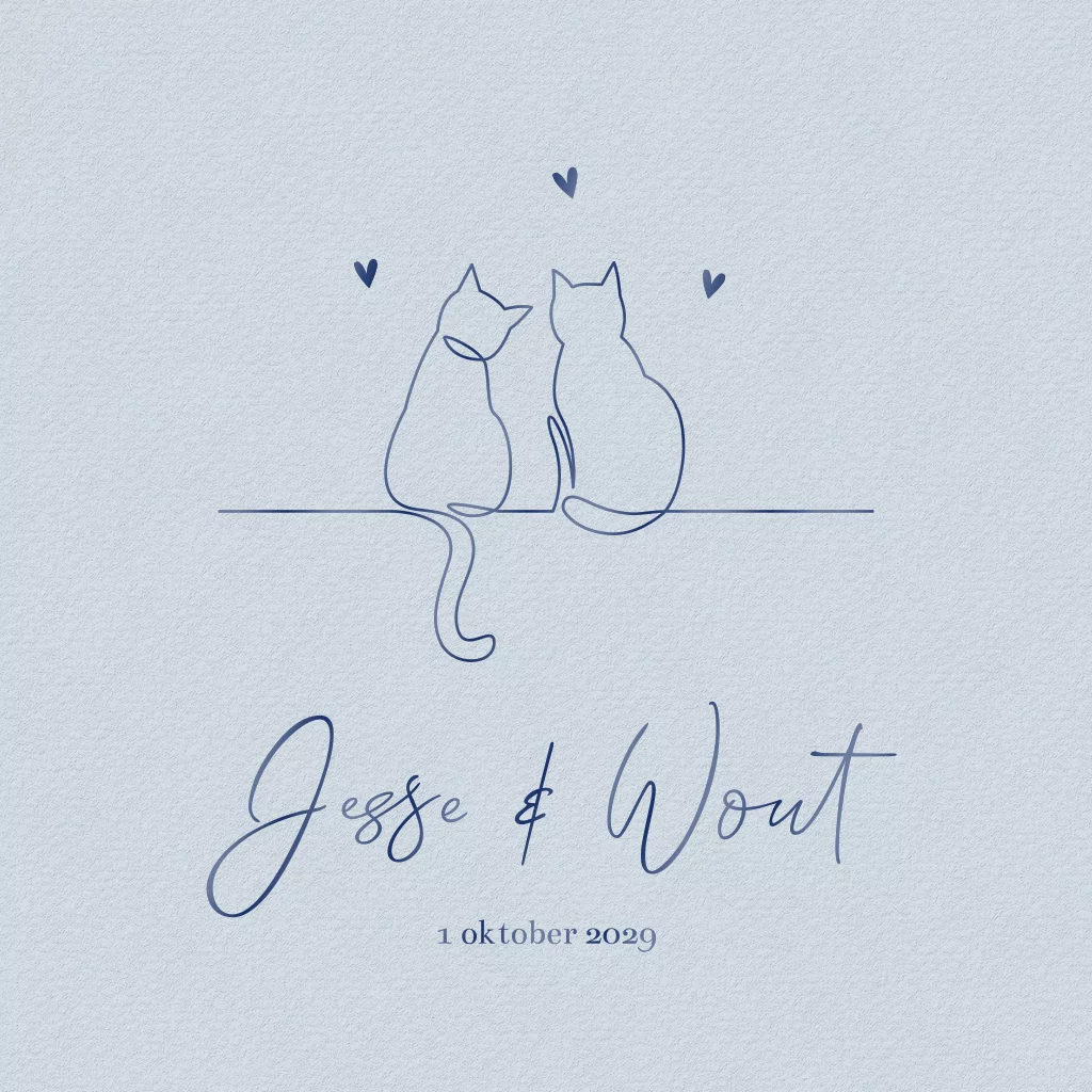 Dit vierkante geboortekaartje voor tweeling jongens heeft een zachtblauwe achtergrond met een lichte structuur. Voorop in hoogglans blauw staat een illustratie van twee katten, die met één vloeiende lijn zijn getekend. De kaart heeft afgeronde hoeken en is vierkant dubbelgevouwen. Boven de namen van de tweeling en de katjes zijn speelse hartjes verwerkt. Je kunt de tekst volledig aanpassen via de editor om het kaartje uniek en persoonlijk te maken voor de geboorte van jullie twee jongetjes.