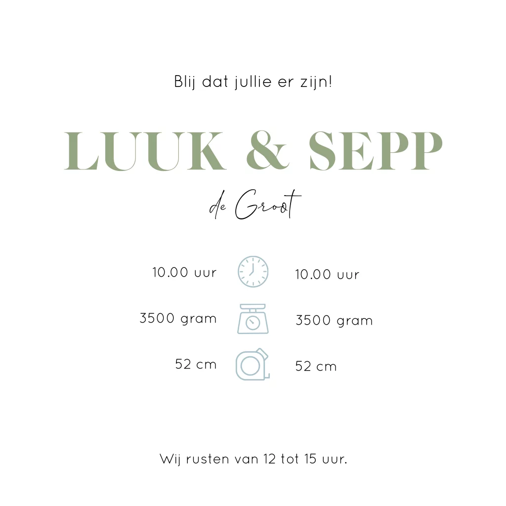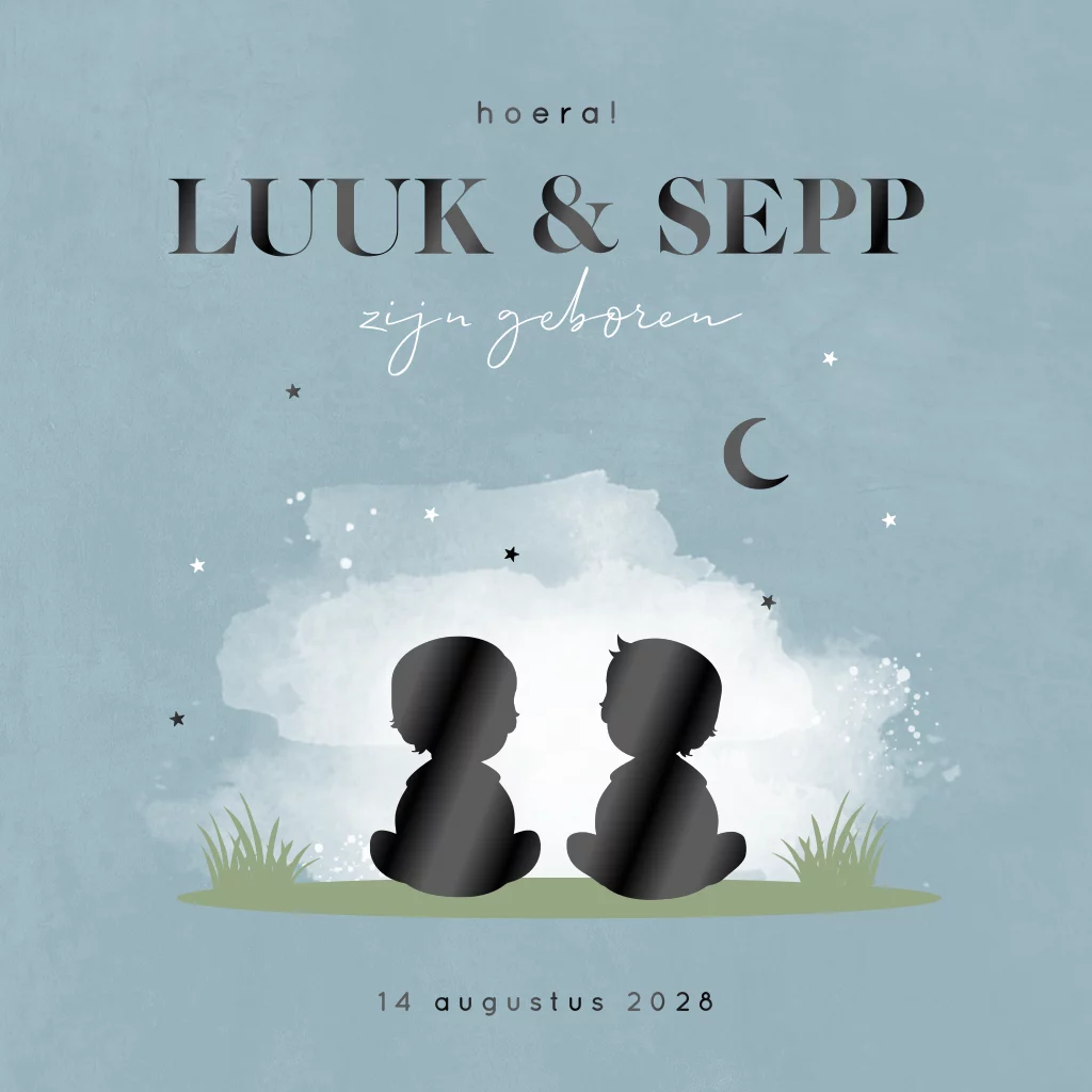 Hip geboortekaartje voor tweeling broertjes in blauw met hoogglans zwarte silhouetjes. De twee jongetjes zitten op het gras en kijken naar de ondergaande zon. De maan staat al aan de hemel. Dit tweelingkaartje kun je heel simpel aanpassen in onze editor. Misschien wil je er wel een hond of kat bij? Of een oudere broer of zus. Het kan allemaal.