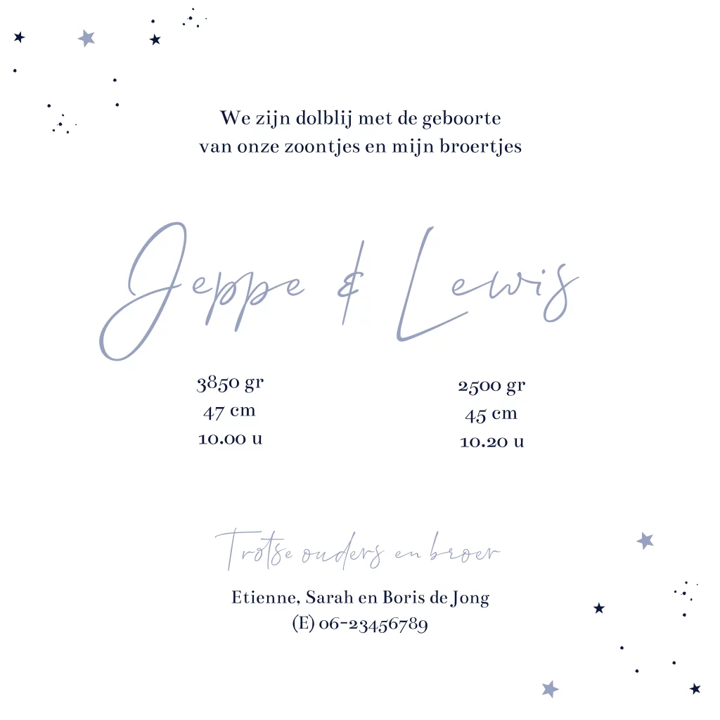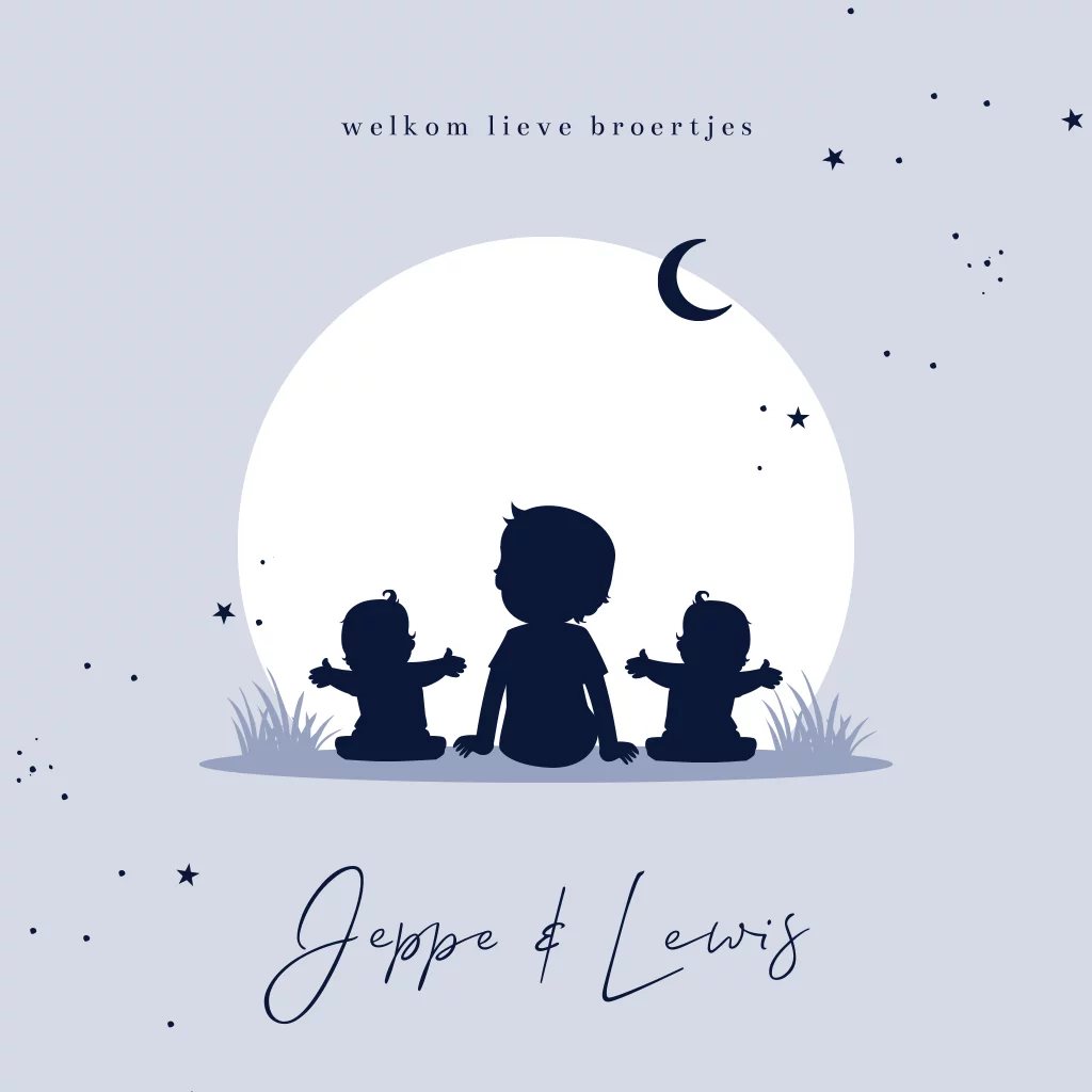 Krijgt jullie oudste zoon twee kleine broertjes erbij? Hoe leuk is dan dit geboortekaartje met tweeling jongens en een grote broer in het midden zittend en kijkend naar de zonsondergang. Je kunt de tekst eenvoudig aanpassen en ook de kleuren en silhouetjes. Als je hulp nodig hebt dan horen we het graag.