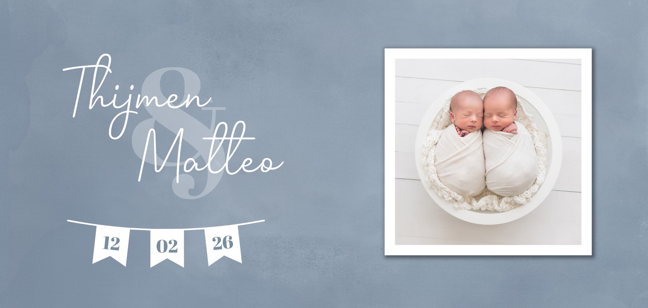 Op zoek naar een stijlvol geboortekaartje voor je tweeling? Ga dan voor dit grijsblauwe ontwerp met fotokader en wit slingertje. In het slingertje komt de geboortedatum van je twee zoontjes. Op de achterkant is ruimte voor nog drie kleine foto's en alle geboortegegevens. Sierlijke letters worden gecombineerd met grote initialen in een lichte grijsblauwe kleur.