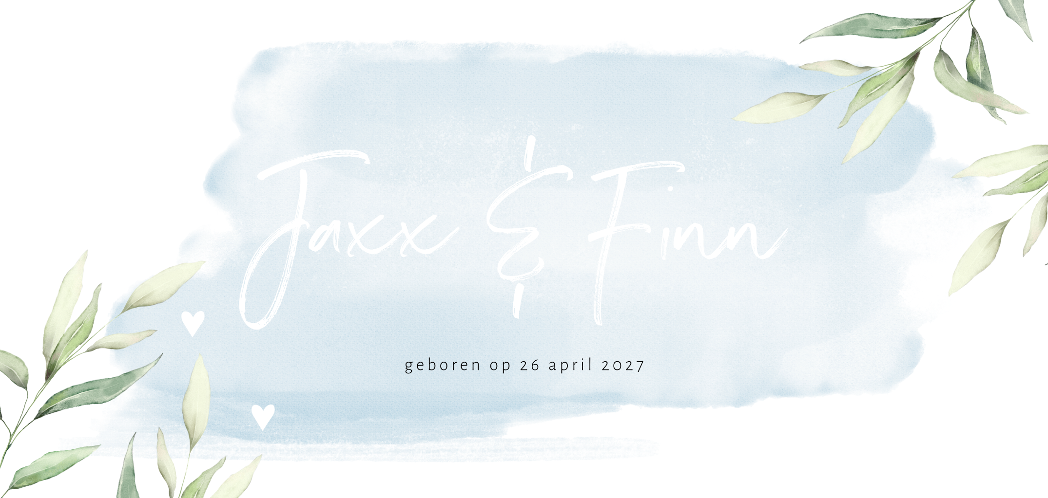 Twee lieve jochies verdienen ook een lief geboortekaartje. Verstuur dit dromerige ontwerp met lichtblauwe waterverf, geschilderde blaadjes en goudfolie hartjes om de komst van je tweeling aan te kondigen. De namen van je zoontjes komen in sierlijke typografie voorop, ook in glimmend goud. De goudfolie in combinatie met waterverf elementen zorgen voor een trendy look.