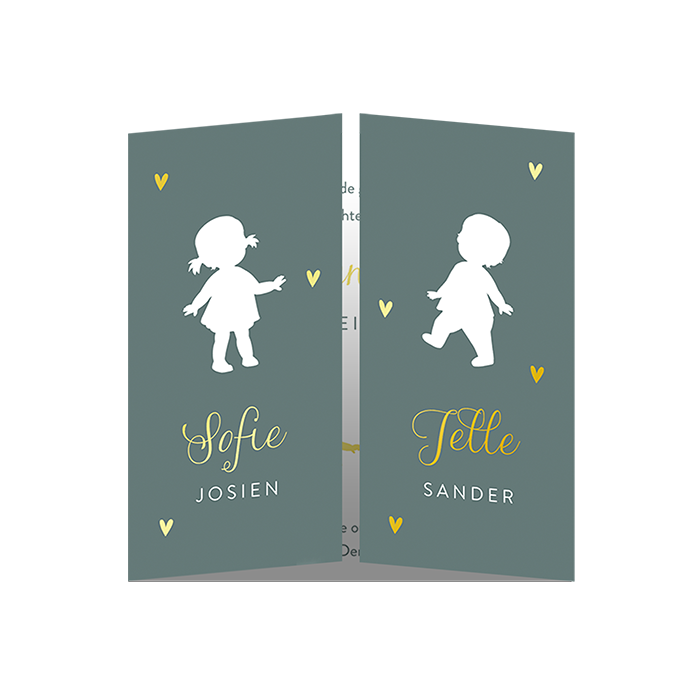 Stijlvol geboortekaartje voor een jongen en meisje. Dit tweeluik voor een tweeling opent in het midden en toont twee silhouetten – één van een jongetje en één van een meisje – met hun namen in glanzende goudfolie.