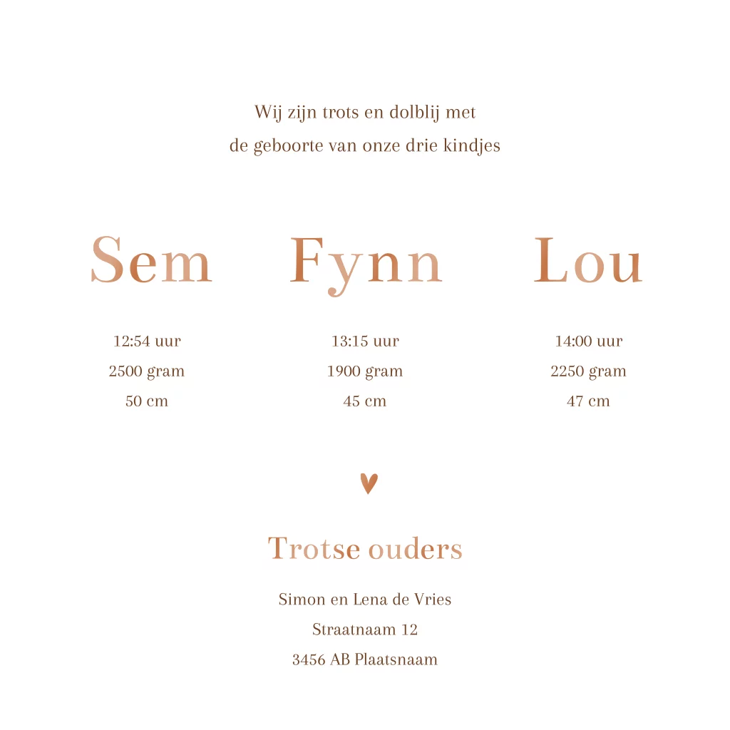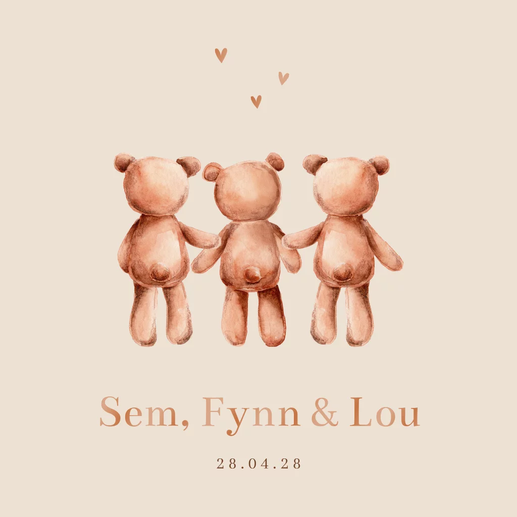 Een lief geboortekaartje ontworpen voor de komst van een drieling. Op de voorkant staan drie schattige beertjes van achteren gezien op een rij. Boven elk beertje straalt een hartje, met daaronder de namen van de kleintjes in hoogglans. Dit kaartje is eenvoudig aan te passen met onze kaarteneditor, zodat het helemaal naar wens gemaakt kan worden. Een warm en uniek ontwerp om dit bijzondere moment te vieren!