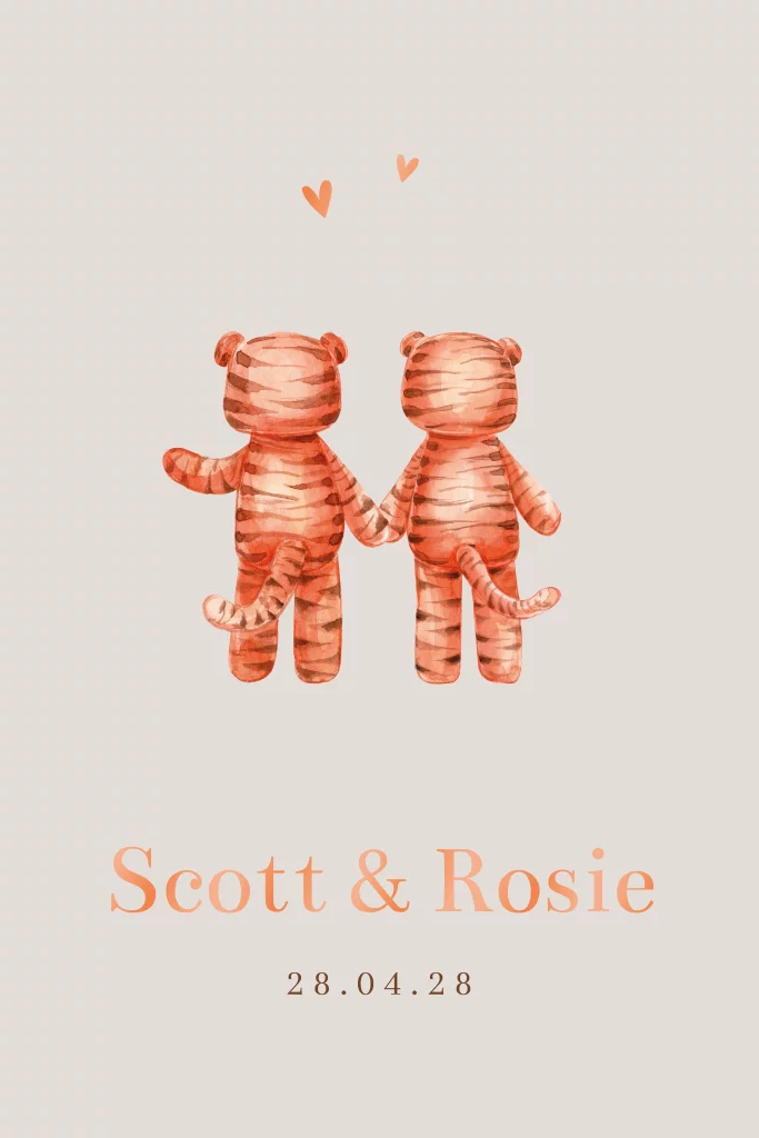 Een lief geboortekaartje voor een bijzondere tweeling. Twee schattige tijgertjes die hand in hand staan, symbool voor de speciale band tussen hen. Met dit zachte en warme ontwerp maak je een uniek kaartje voor de geboorte van jullie kleintjes. Pas het kaartje eenvoudig zelf aan in onze editor om het helemaal naar wens te maken.