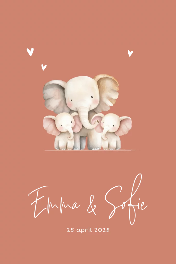 Dubbel zoveel liefde! Op dit hartverwarmende geboortekaartje staan een grote olifant met twee kleine olifantjes zij aan zij — het perfecte beeld voor de geboorte van een tweeling. De warme achtergrondkleur en de zachte illustratie zorgen voor een vrolijk en liefdevol ontwerp. Pas de namen en datum eenvoudig aan in de kaartenmaker en maak er jullie eigen kaartje van.