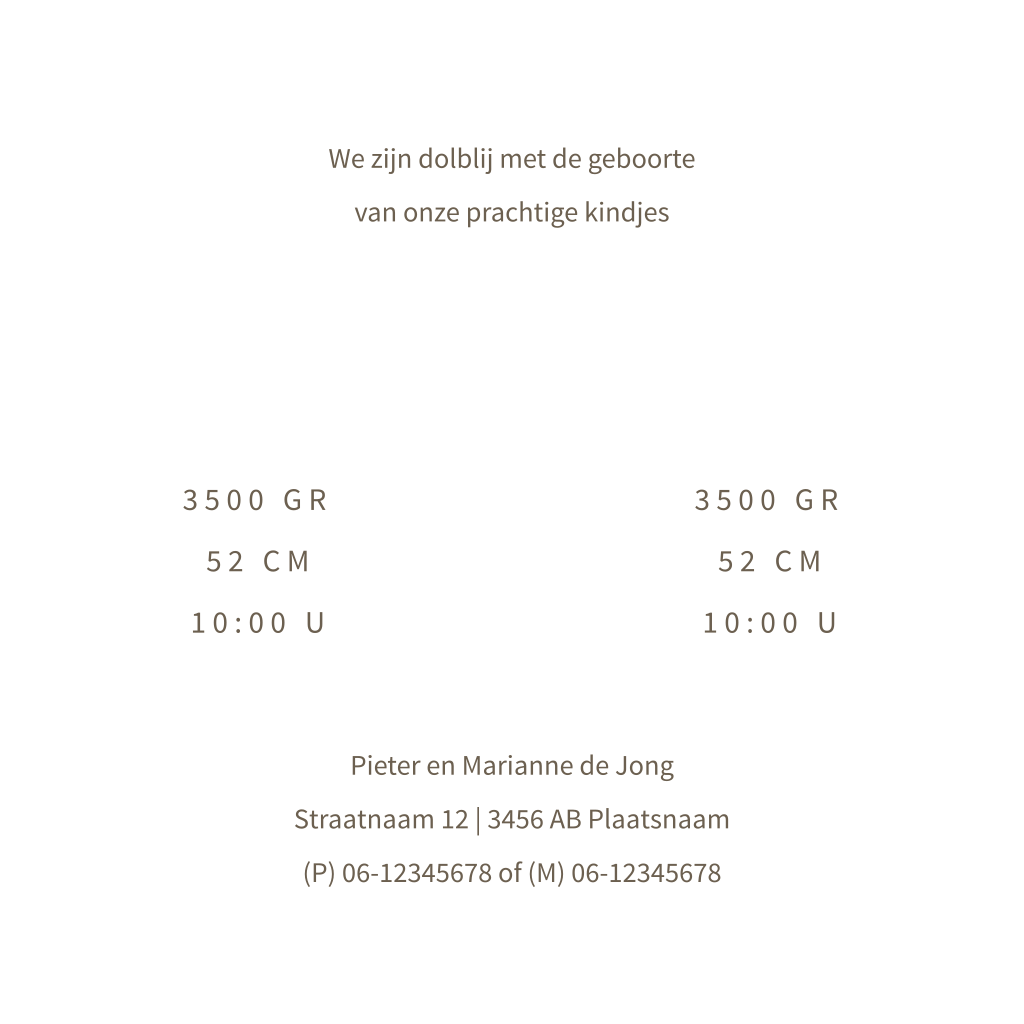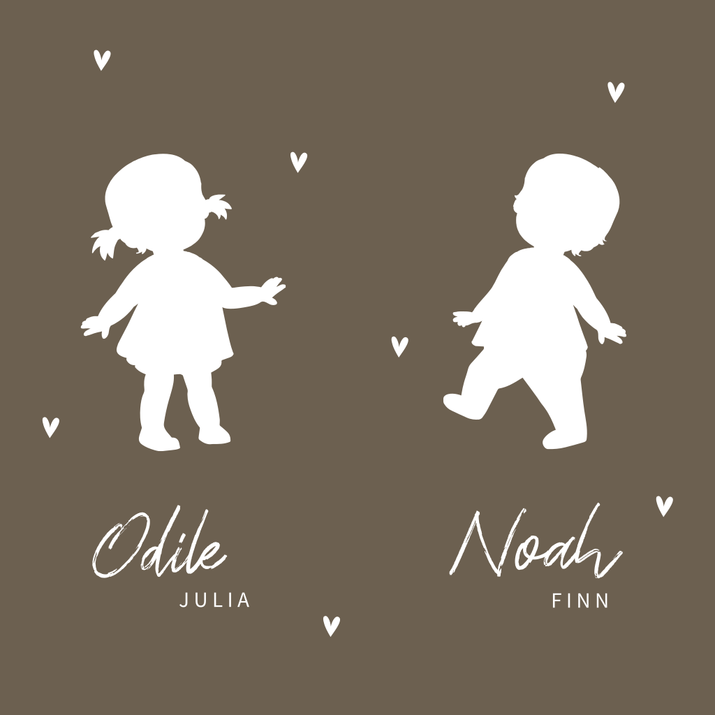Een bruin geboortekaartje met silhouet kindjes, goudfolie hartjes en sierlijke typografie. Het bruin combineert prachtig met de glimmende goudfolie details. Toch liever een andere kleur? Pas deze naar eigen smaak aan in onze ontwerptool. Ook de foliedruk kun je eventueel van kleur veranderen, naar bijvoorbeeld zilver of rosegoud. Zo maak je dit leuke tweeling geboortekaartje helemaal naar je eigen zin. Bestel een proefdruk om het eindresultaat te kunnen bewonderen.