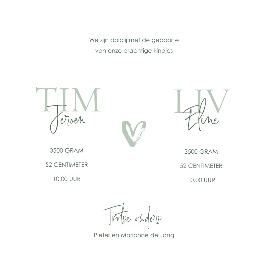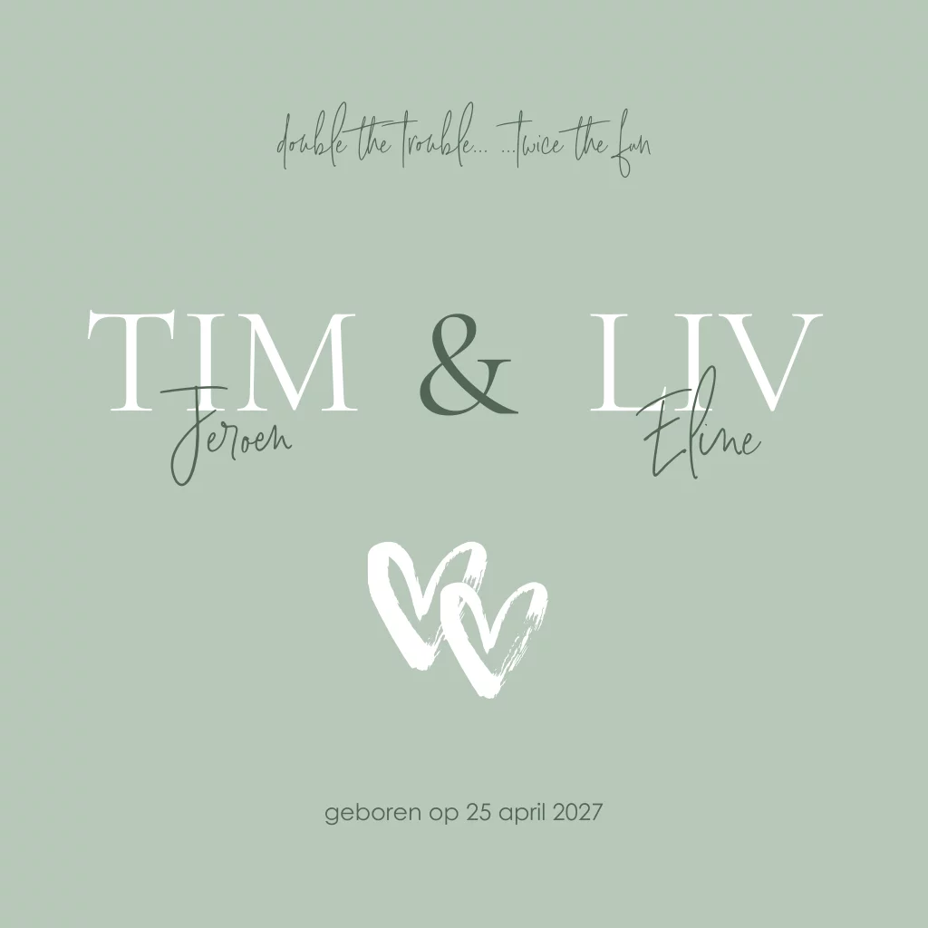 Zijn er twee kindjes op komst? Gefeliciteerd! Dit lieve geboortekaartje is perfect voor een tweeling. De namen van je zoon en dochter komen in klassieke letters voorop, met daarbij ook hun tweede naam in sierlijke typografie. De hartjes maken dit tot een lieflijk geheel. Aan de binnenzijde is ruimte voor een mooie foto van je twee kindjes. Zo maak je er gemakkelijk een persoonlijk geboortekaartje van. Bestel een proefdruk om te zien hoe het gedrukte resultaat is.