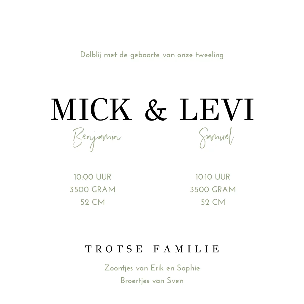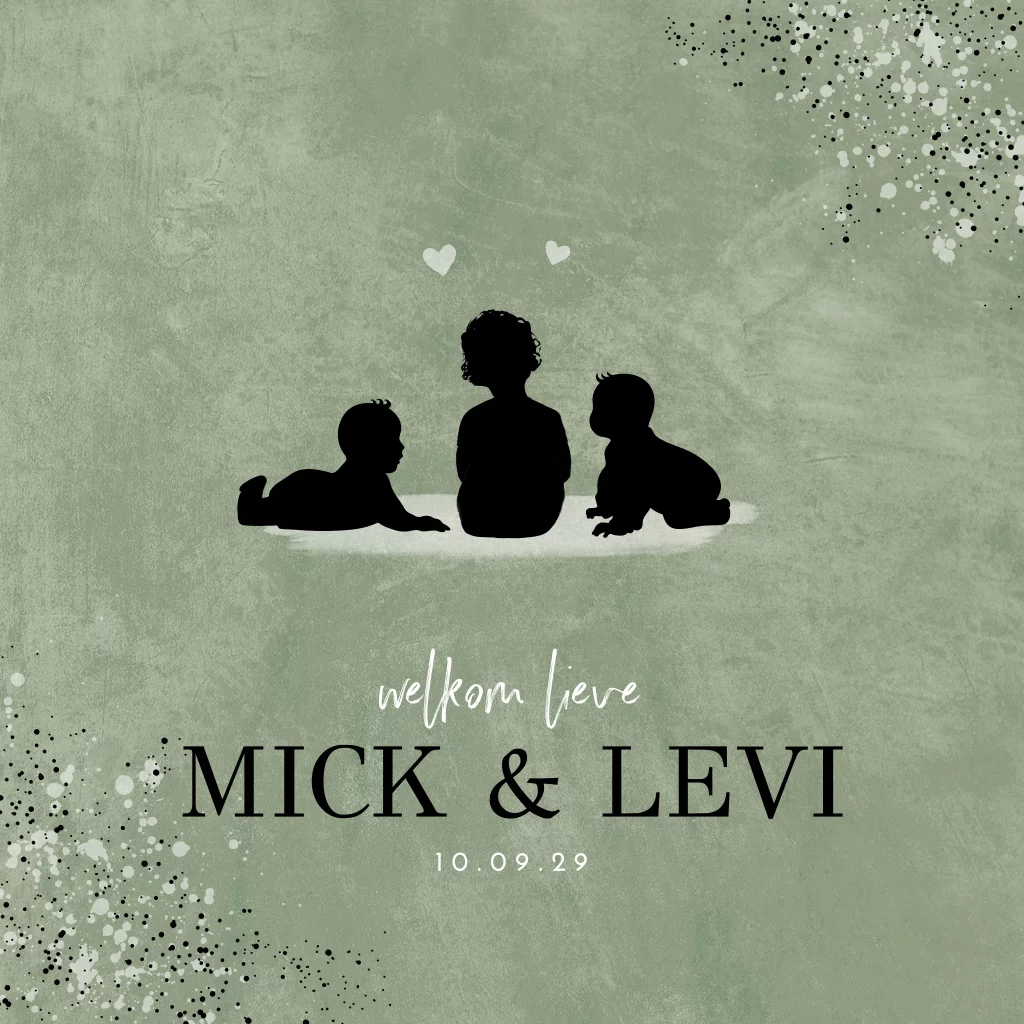 Van dit populaire geboortekaartje is er nu ook in een variant met grote broer en tweeling! De silhouetjes van de broer en de tweeling zijn in het zwart op een groene ondergrond maar ook mogelijk in een andere kleur.