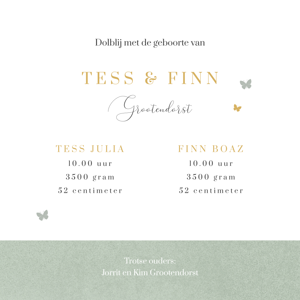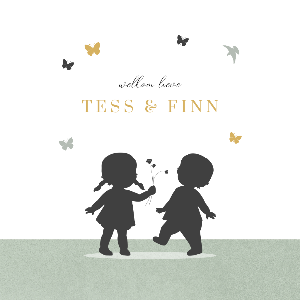 Is er een tweeling op komst? Wat leuk! Kondig hun geboorte aan met dit vierkante geboortekaartje met silhouetjes, vlinders en klassieke typografie. De okergele kleur van de vlindertjes past mooi bij de zachtgroene tint van de ondergrond. Pas dit kaartje eventueel verder aan naar eigen smaak en bestel een proefdrukje. Een mooi kaartje om de komst van je zoontje en dochtertje te vieren!