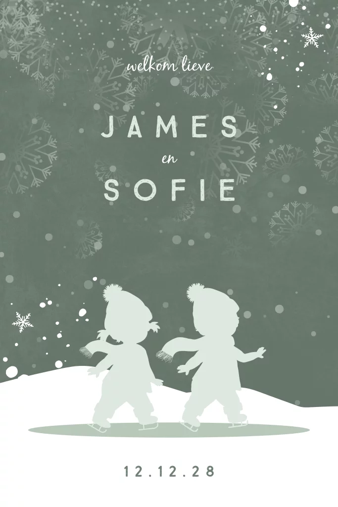 Groen winter geboortekaartje voor een tweeling met silhouetten van een jongen en meisje op schaatsen. Sneeuwvlokjes dwarrelen om hen heen. Kondig de komst van je wintertweeling aan in stijl! Pas dit tweelingkaartje zelf aan in onze editor en bestel een proefdruk om deze in het echt te kunnen bewonderen.