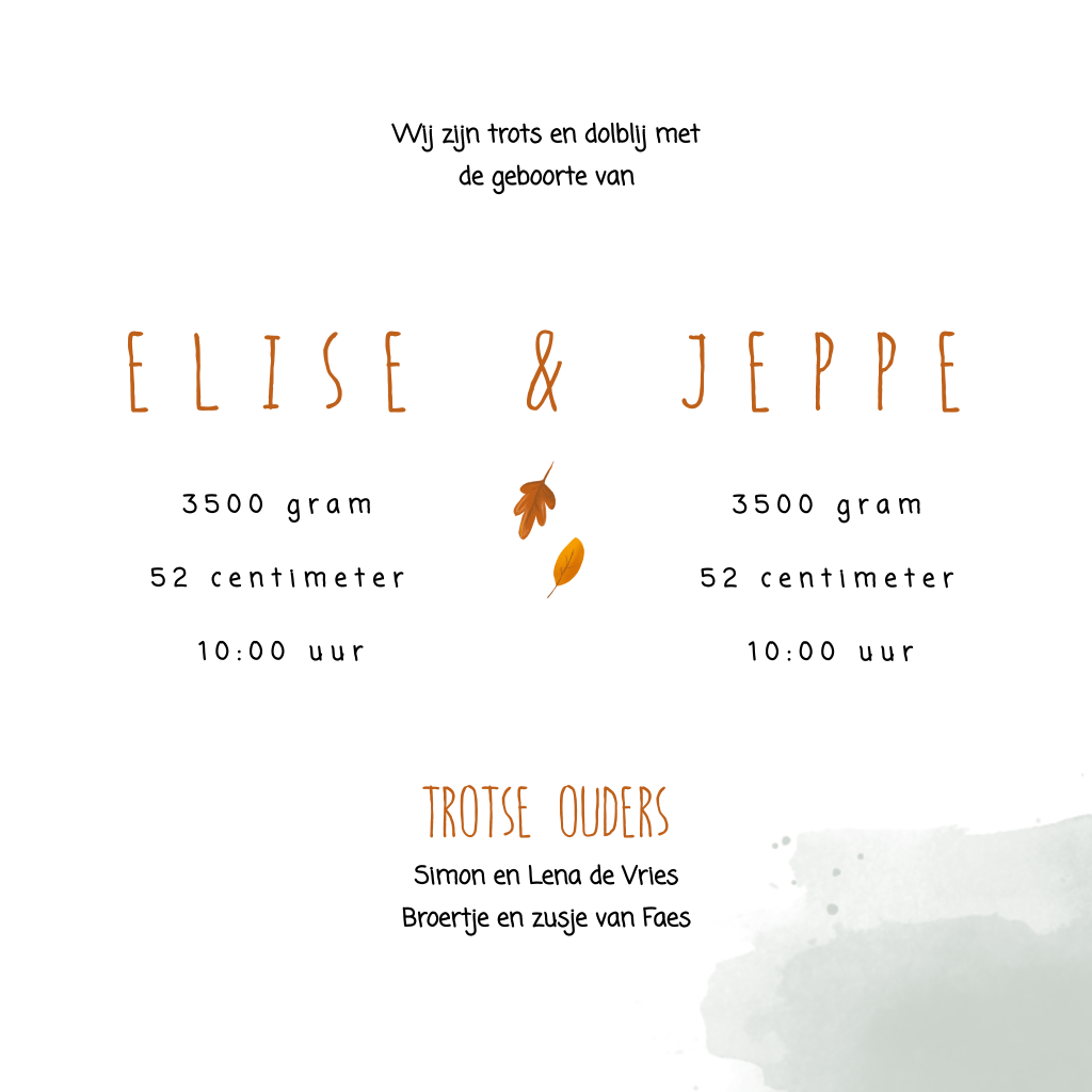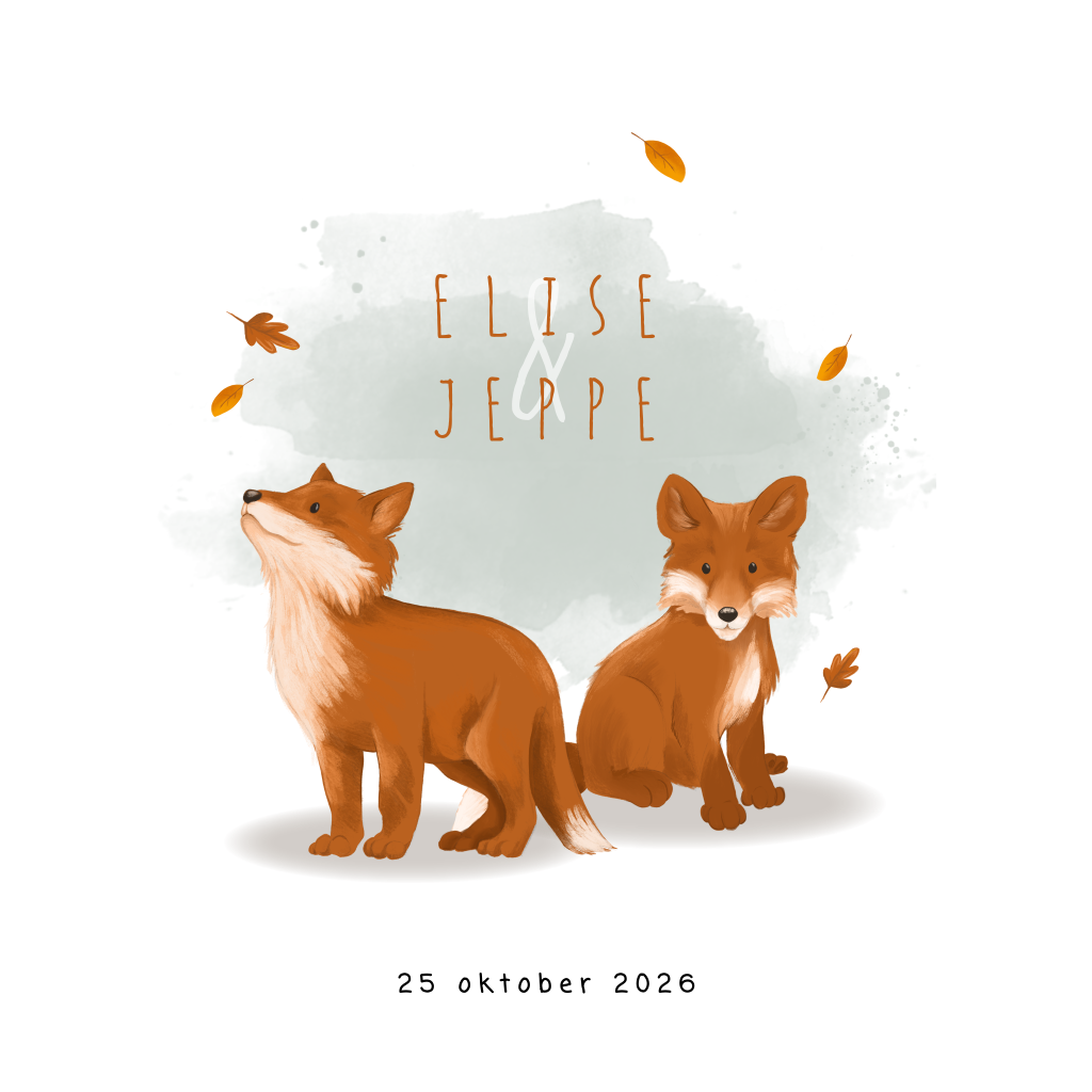 Op zoek naar een herfstachtig geboortekaartje voor je pasgeboren tweeling? Dan is dit unisex ontwerp met lieve vosjes een kaart voor jou. Op de voorzijde dwarrelen verschillende herfstbladeren en mooie grijsgroene waterverf. Met een hip en modern lettertype staan de namen van kindjes op de kaart. Pas het ontwerp naar wens aan en bekijk de kaart in het echt door een proefdruk te bestellen.