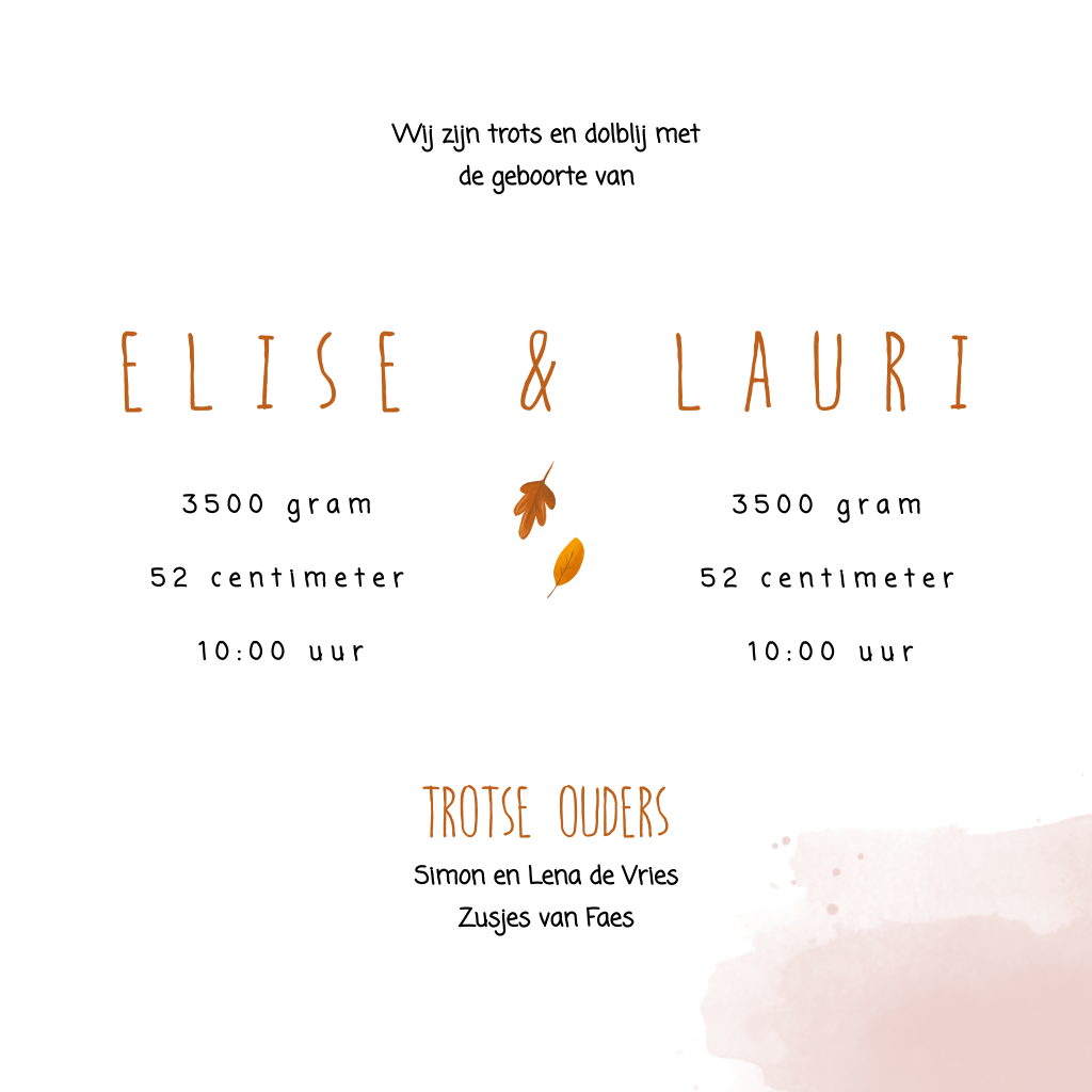 Uitgerekend van een tweeling in de herfst? Dit getekende geboortekaartje is perfect voor de geboorte van jullie dochtertjes. Op de voorzijde zie je twee vosjes bij elkaar. De kaart is versierd met roze waterverf en herfstbladeren. Pas de kleur van de teksten en de waterverf aan om de kaart te personaliseren. Een lief ontwerpje om de komst vanje dochters mee aan te kondigen!
