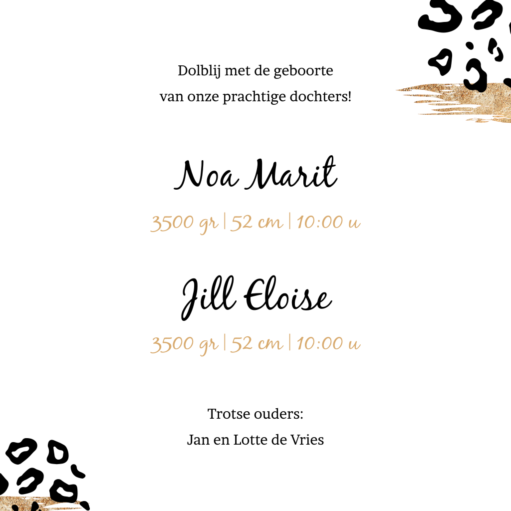Een vrolijk geboortekaartje voor je twee dochtertjes! Drie leeuwtjes glimlachen je toe, twee kleintjes met roze strikjes en een grote. De rest van de kaart is versierd met goudkleurige verfstrepen en zwarte panterprint patroontjes. Aan de binnenkant komen de twee kleine welpjes terug en is er ruimte voor een lief gedichtje over je tweeling. Benieuwd naar dit kaartje? Bestel een proefdruk!