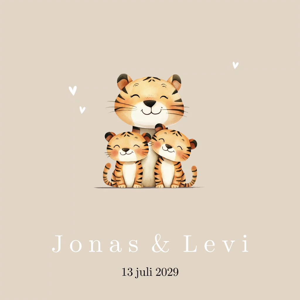 Twee keer zoveel avontuur! Op dit speelse geboortekaartje staan een grote tijger met twee vrolijke tijgertjes, perfect voor een tweeling. De zachte beige achtergrond en schattige illustratie maken dit een warm en neutraal ontwerp. De namen op de voorkant zijn afgewerkt met chique goudfolie, voor een stralend accent. Pas eenvoudig aan naar wens in de kaartenmaker.