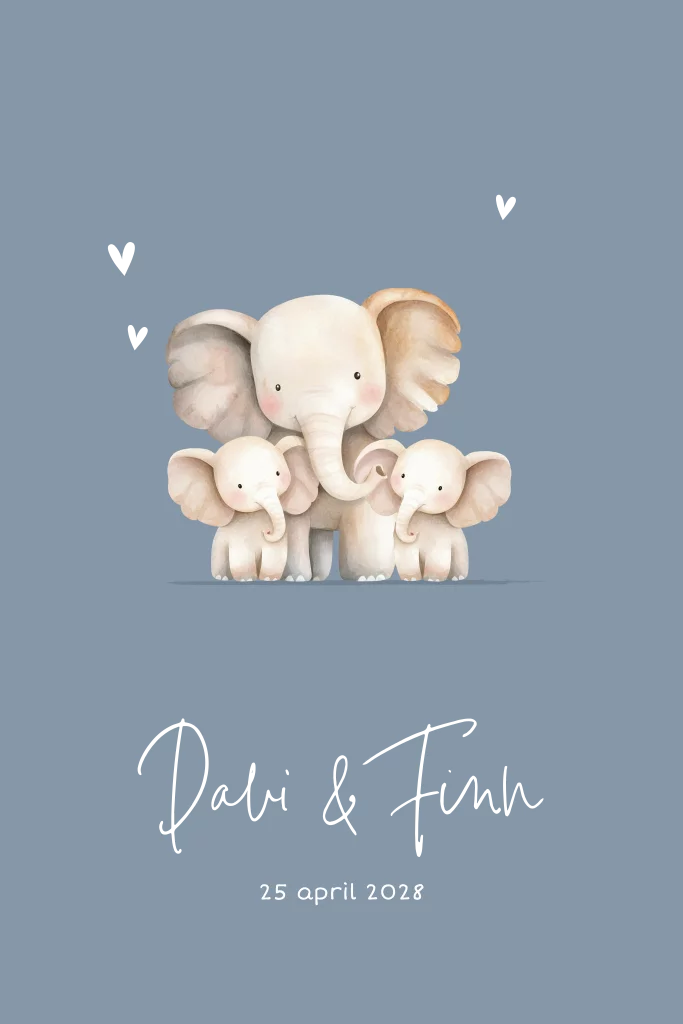 Hoe lief is dit geboortekaartje met een trotse grote olifant en twee schattige olifantjes ernaast? Ideaal voor de geboorte van een tweeling! De zachte kleuren, lieve hartjes en rustige achtergrond zorgen voor een warm junglegevoel. Perfect voor ouders die op zoek zijn naar een stijlvol maar speels kaartje met een persoonlijk tintje.