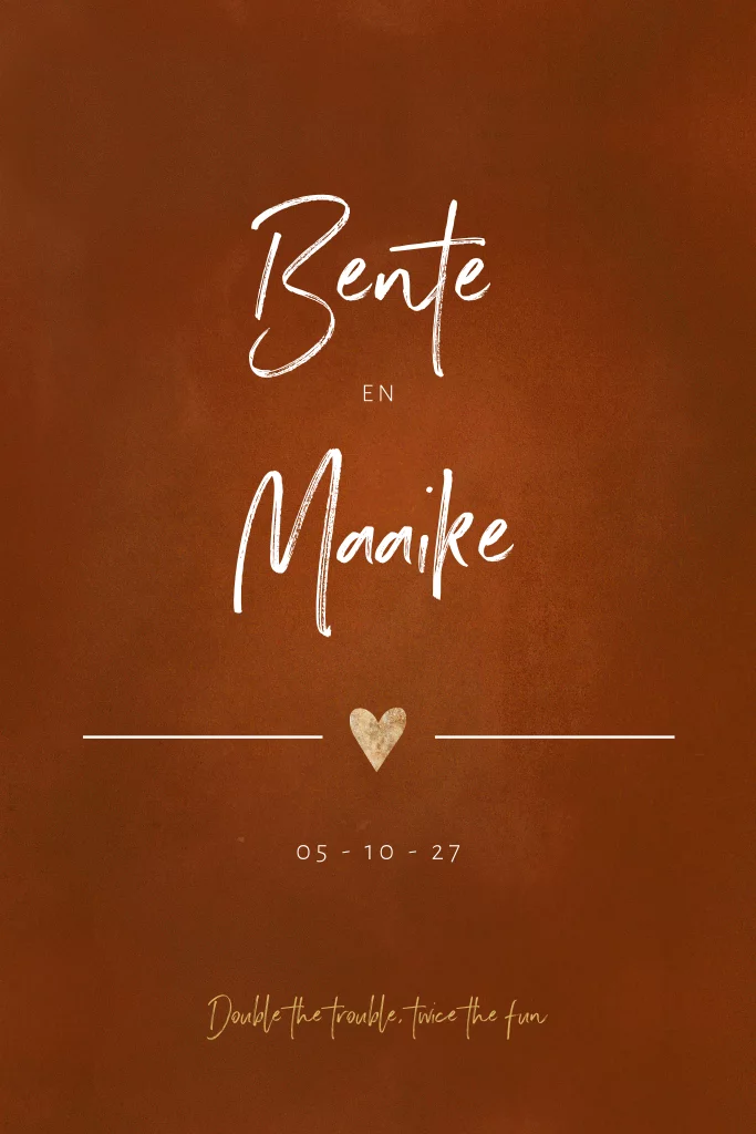 Zijn er twee meisjes op komst? Gefeliciteerd! Dan is het tijd om een mooi geboortekaartje uit te zoeken. Wat denk je van dit roestbruine ontwerp met witte typografie en een goudkleurig hartje? Op de voorkant is ruimte voor een lieve zin of quote en op de achterkant ook. Daarnaast kun je alle geboortegegevens van je kindjes kwijt op de achterkant van dit enkele ontwerp. Bestel een proefdruk van deze kaart om te zien of deze helemaal naar je zin is.