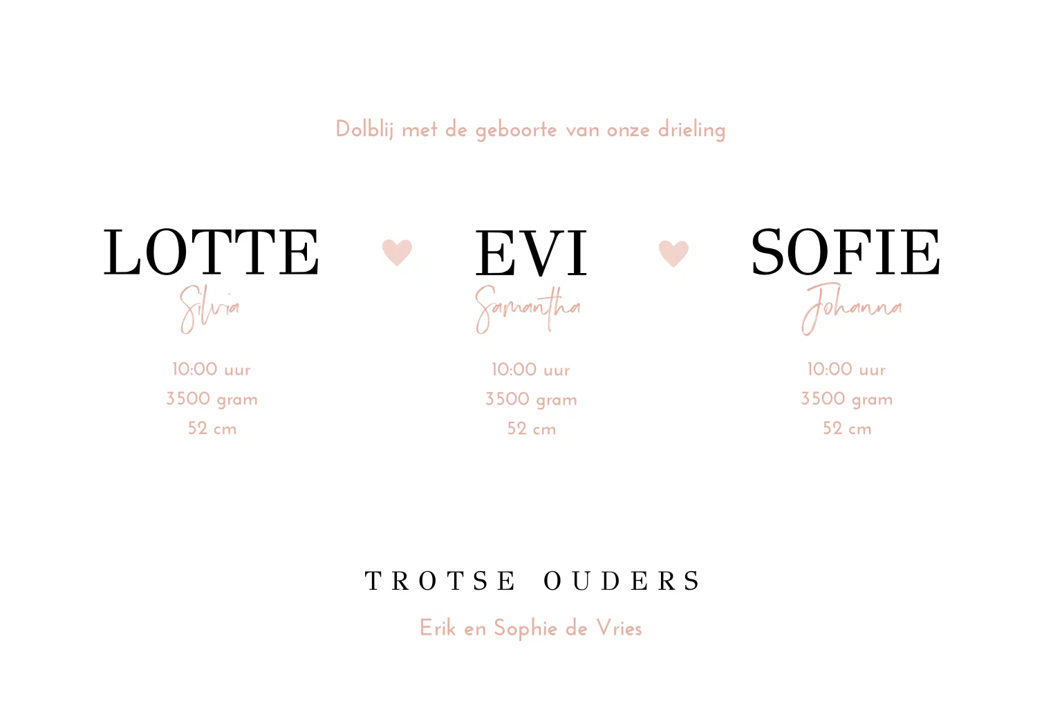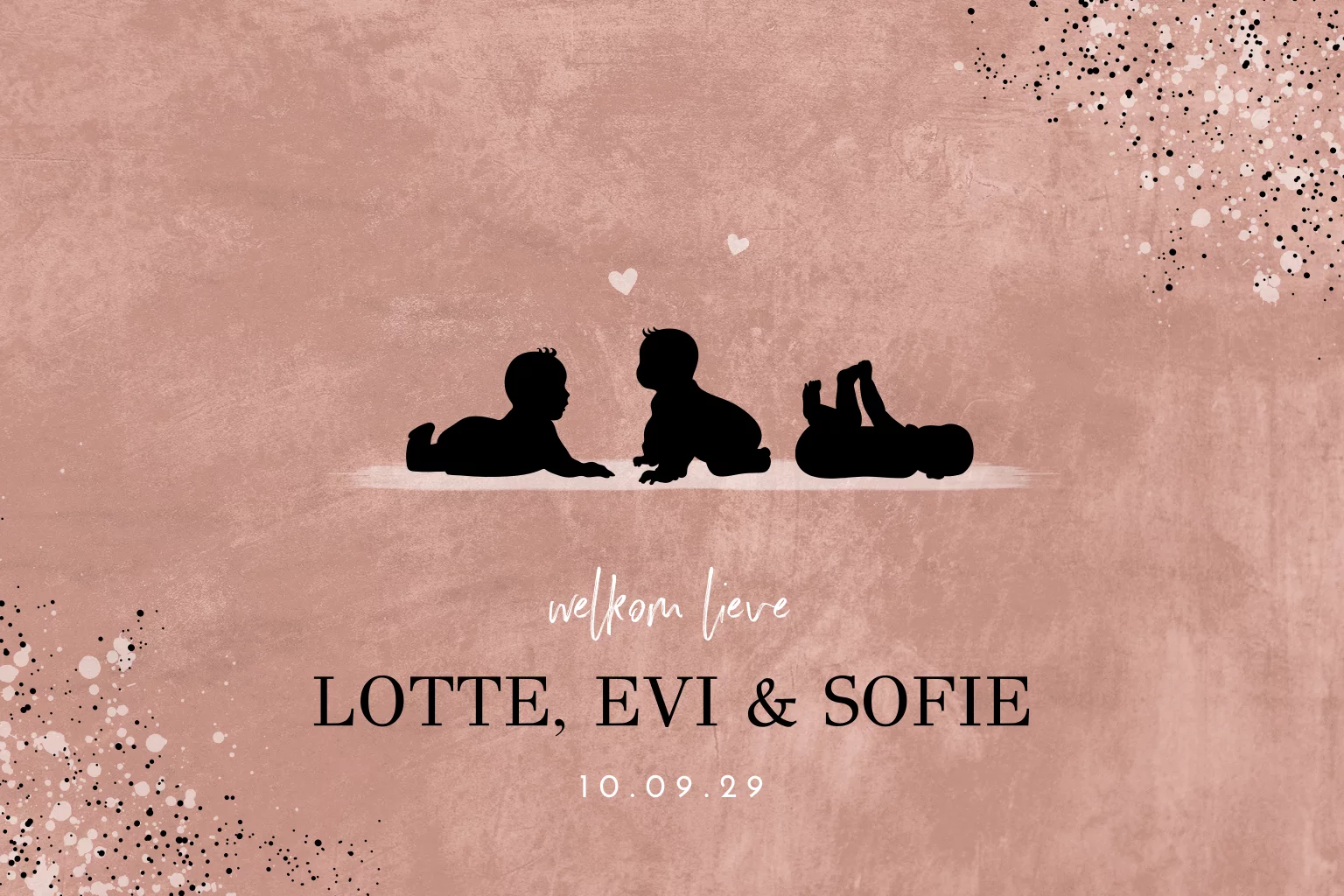 Op zoek naar een speciaal geboortekaartje om de komst van jullie drie meisjes te vieren? Bekijk ons prachtige drieling geboortekaartje, ontworpen voor de geboorte van drie meisjes. Dit geboortekaartje heeft een trendy ontwerp met schattige silhouetten van drie baby’s tegen een zachtroze achtergrond, perfect voor drie kleine meisjes. De speelse hartjes en verfijnde details maken het kaartje helemaal af.