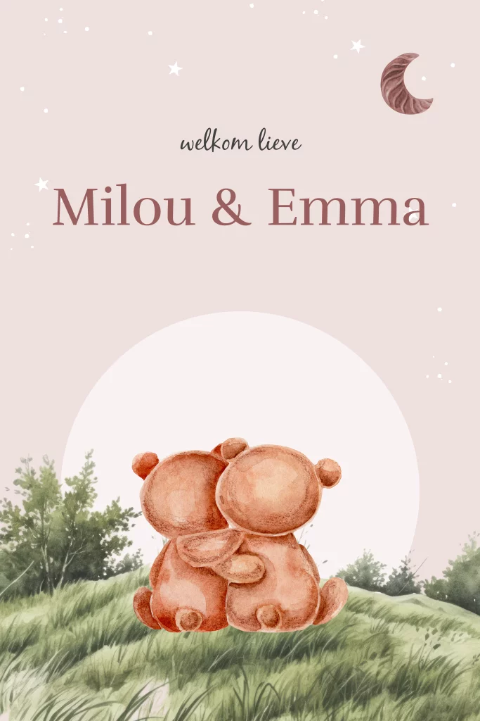 Lief geboortekaartje voor een meisjes tweeling met een zachtroze waterverf illustratie. Twee knuffelende beertjes omarmen elkaar en genieten van een zonsondergang terwijl de maan en sterren al op zijn.