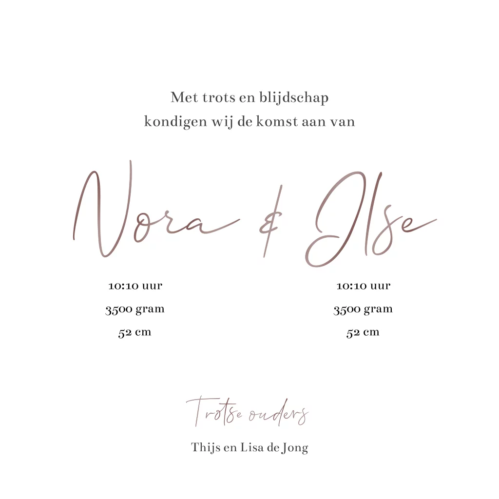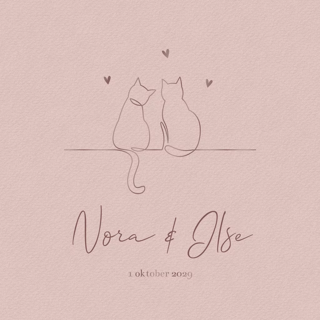 Stijlvol, vierkant geboortekaartje voor tweelingmeisjes met een zachte roze achtergrond en een sierlijke illustratie van twee katten, getekend met één vloeiende lijn. De kaart is vierkant dubbel met afgeronde hoeken, wat zorgt voor een zachte uitstraling, dit kunje in de editor aanpassen. De tekst en illustratie staat in donkerroze hoogglans, wat een speelse touch toevoegt. Je kunt de tekst naar wens aanpassen via de editor en daarna gelijk een drukproef bestellen. Deze unieke kaart is perfect voor het aankondigen van de geboorte van jullie tweeling. Zeker als je thuis twee katten hebt natuurlijk.