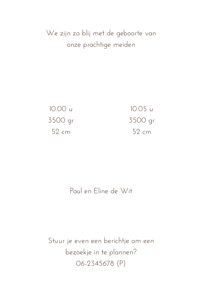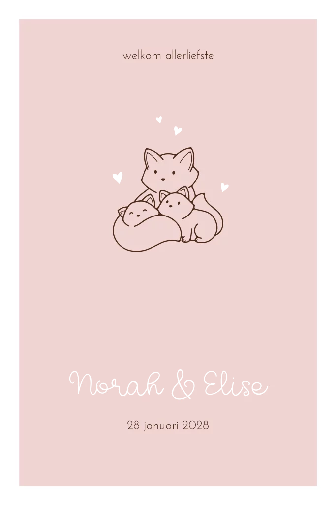 Een eenvoudig, maar ontzettend schattig geboortekaartje voor een tweeling. Op dit lichtroze kaartje staan twee lieve baby vosjes en een grote vos getekend. De goudfolie hartjes en namen maken het geboortekaartje helemaal af. Kies eventueel een andere achtergrondkleur of verander de foliekleur in onze editor.