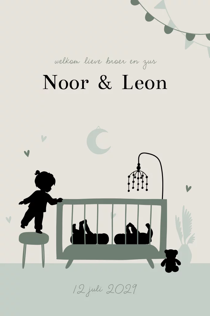 Silhouet geboortekaartje grote zus bij tweeling in wieg