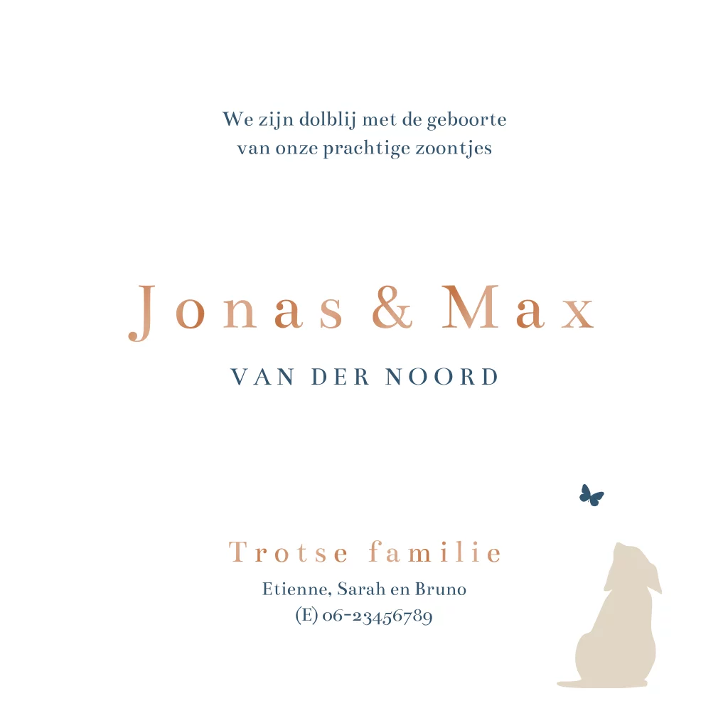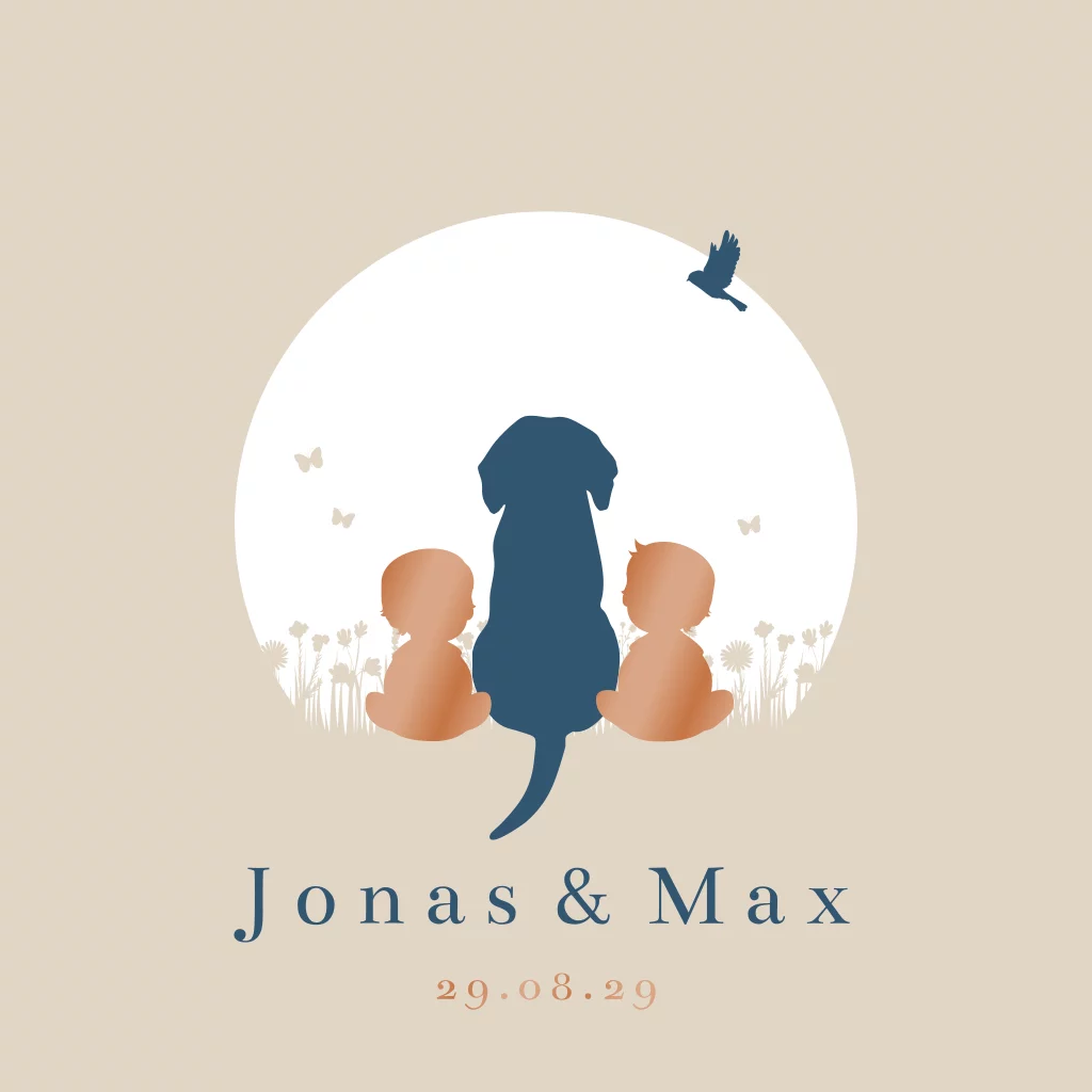 Prachtig geboortekaartje voor een tweeling met twee jongetjes in silhouet met een grote hond in het midden. Ze zitten in een bloemenveld en kijken naar een zonsondergang. Superleuk als jullie dus een hond als huisdier hebben en er een tweeling jongetjes op komst is. je kunt de hond in de editor vervangen door een andere hond of kat of zelf ook een grote broer of zus. Hulp nodig? We helpen je graag!