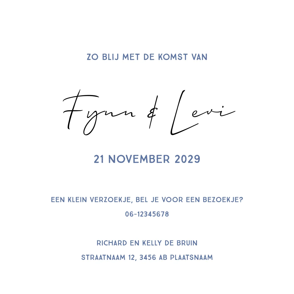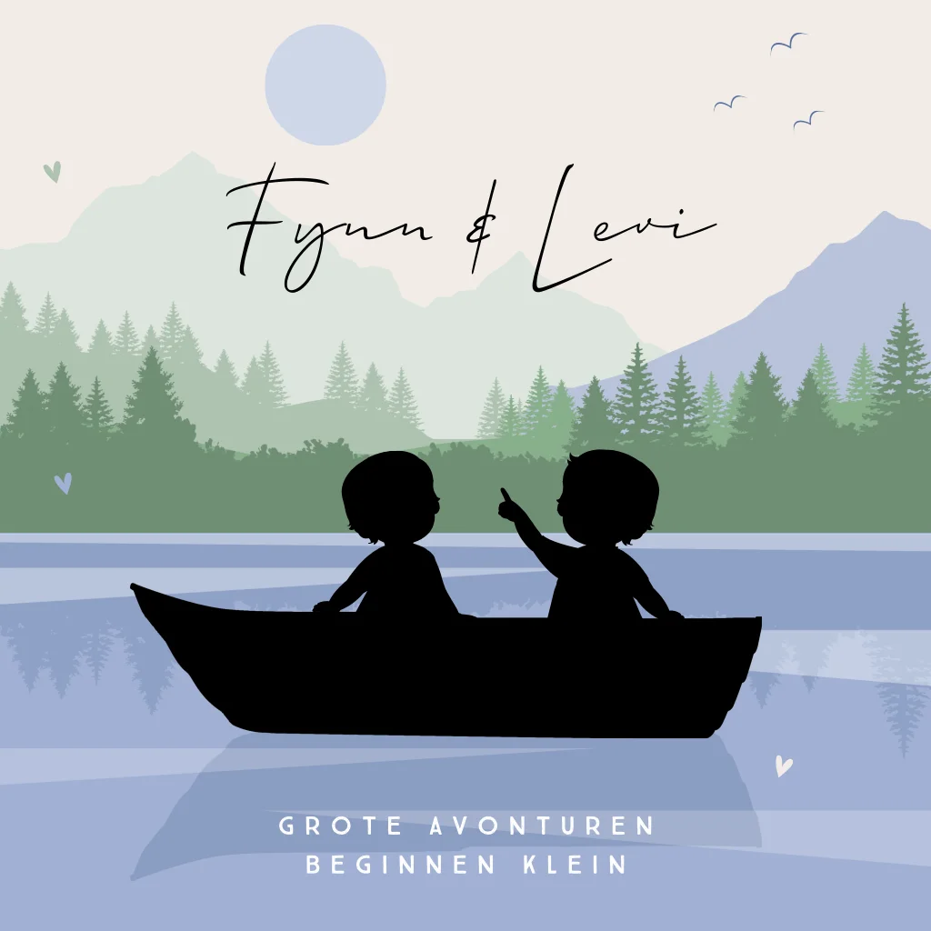 Een blauw en groen geboortekaartje voor twee jongens met twee silhouetjongetjes in een roeibootje. Ze varen samen door een landschap met bergen en bomen, wat het kaartje een avontuurlijke uitstraling geeft. De kleurencombinatie zorgt voor een frisse en natuurlijke sfeer. Pas het ontwerp voor deze tweeling zelf aan in onze editor en bestel een proefdruk om het resultaat te zien.