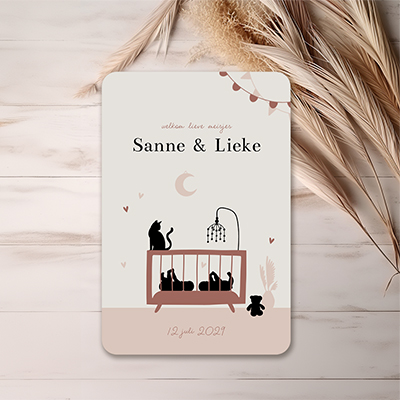 Silhouet geboortekaartje tweeling meisjes in wieg met kat