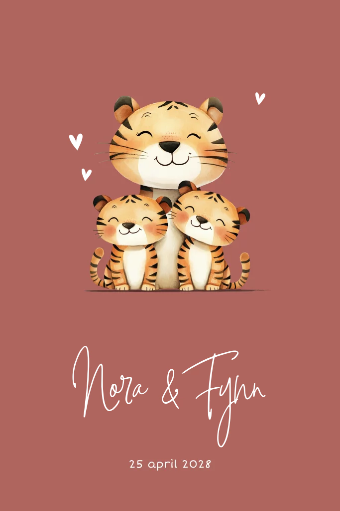 Wat een schatjes! Op dit lieve geboortekaartje stralen twee kleine tijgerbaby’s samen met hun trotse mama. Een warm jungle-thema, perfect voor een tweeling, met speelse hartjes op een stijlvolle roestrode achtergrond. De namen worden gedrukt in glanzende goudfolie, wat zorgt voor een luxe en feestelijke uitstraling.