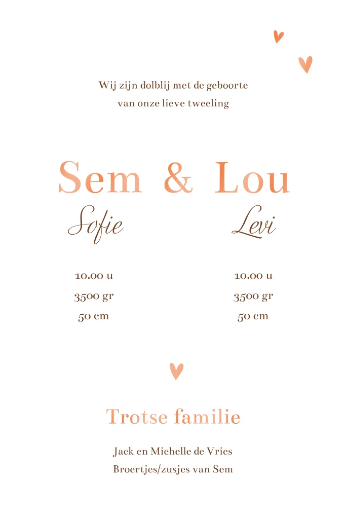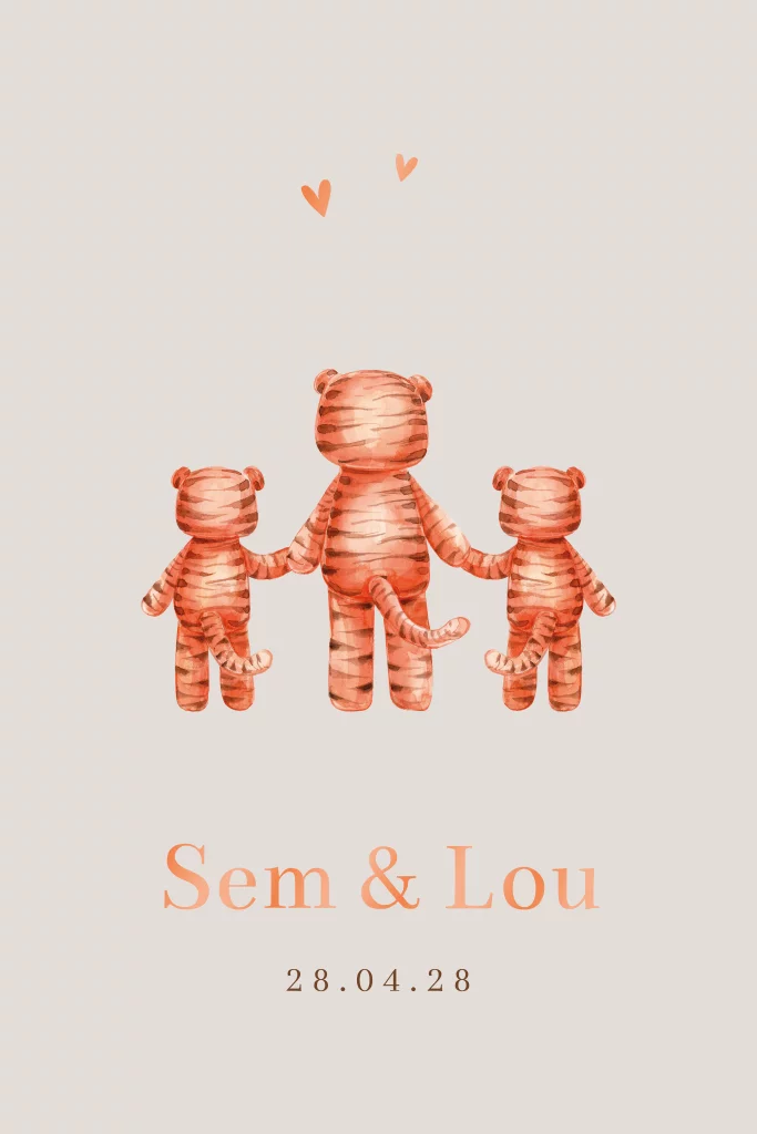 Vier de komst van een prachtige tweeling met dit unieke geboortekaartje dat speciaal ontworpen is voor gezinnen met een oudere broer of zus. Dit liefdevolle kaartje toont drie schattige tijgertjes: de grotere tijger in het midden symboliseert de trotse grote broer of zus, en aan weerszijden staan de twee kleintjes – de pasgeboren tweeling. Met zachte kleuren en een liefdevolle uitstraling straalt dit kaartje warmte en verbondenheid uit, perfect om de geboorte van jullie tweeling op een bijzondere manier aan te kondigen.
