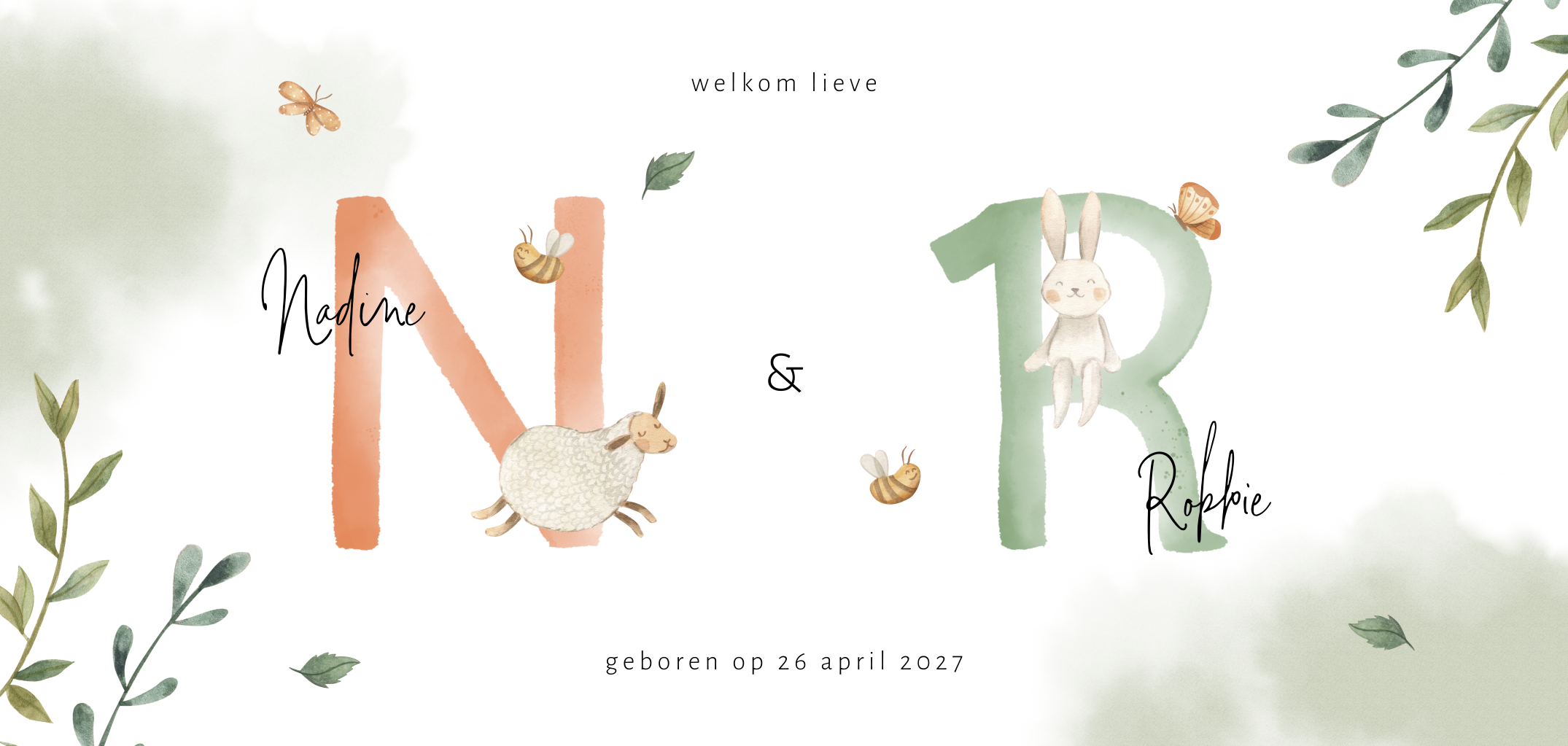 Om de geboorte van je tweeling aan al je vrienden en familie bekend te maken kun je dit lieve geboortekaartje met waterverf diertjes en grote initialen verzenden. Pas de initialen aan naar die van je zoon en dochter in onze ontwerptool. De rest van het kaartje kun je ook verder opmaken naar eigen smaak, voeg bijvoorbeeld meer diertjes toe. De waterverf vlekken op de achtergrond zorgen voor een dromerig effect. Bestel een proefdrukje om de kaart in het echt te kunnen zien.