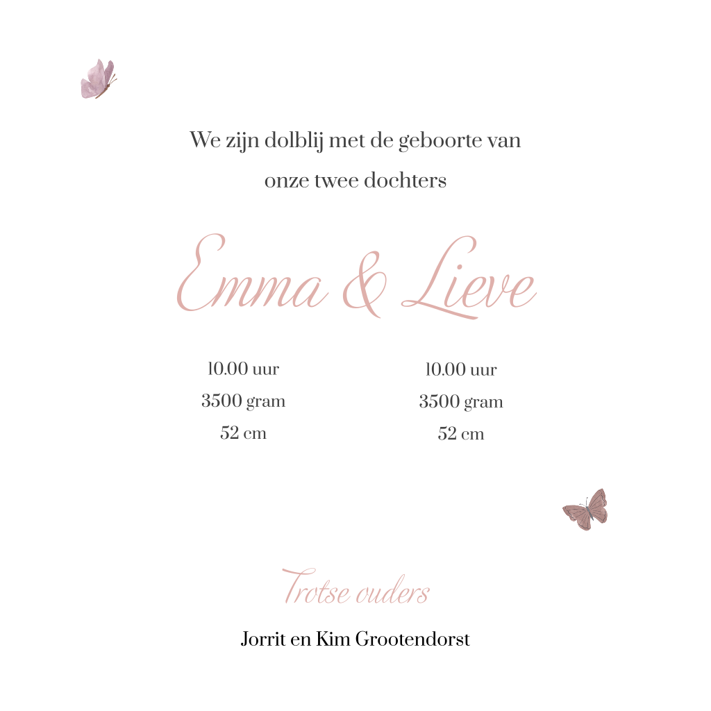 Op zoek naar een leuk tweeling geboortekaartje voor je twee dochtertjes? Kondig de geboorte van je tweeling aan met dit mooie geboortekaartje met twee lieve poesjes op een roze kleedje op een roze achtergrond.