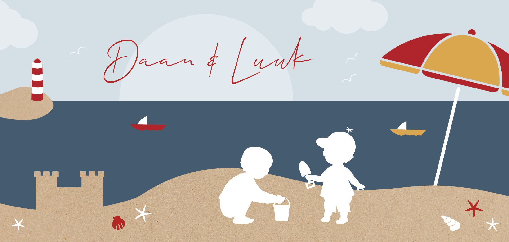 Uitgerekend van een tweeling in de zomer? Dan is dit vrolijke strand geboortekaartje een ontwerp voor jou. Dit zomerse geboortekaartje heeft op de voorzijde een illustratie van twee jongens silhouetjes die spelen op het strand. Om hen heen zie je een parasol, bootjes, een zandkasteel en een vuurtoren. In het zand liggen schelpjes en zeesterren. Op de achterkant van dit kaartje komen de silhouetjes terug, dit keer hand in hand.