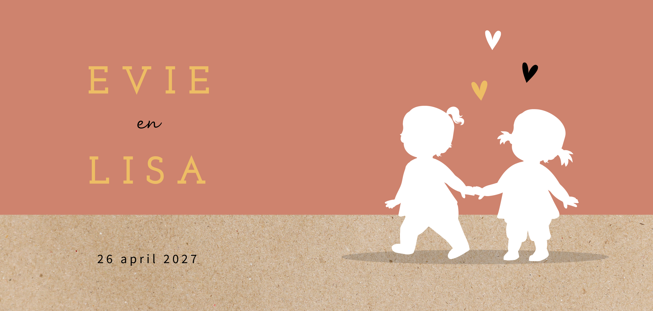 Twee lieve meisjes verdienen een lief geboortekaartje. Wat denk je van dit trendy ontwerp in terra kleur met silhouet kindjes en hartjes? Een schattig kaartje om de komst van je tweeling mee aan te kondigen. Op de achterzijde van dit enkele ontwerp is ruimte voor de namen en geboortegegevens van je dochtertjes. Vergeet niet je eigen contactgegevens, zo kan iedereen een kaartje terug sturen.