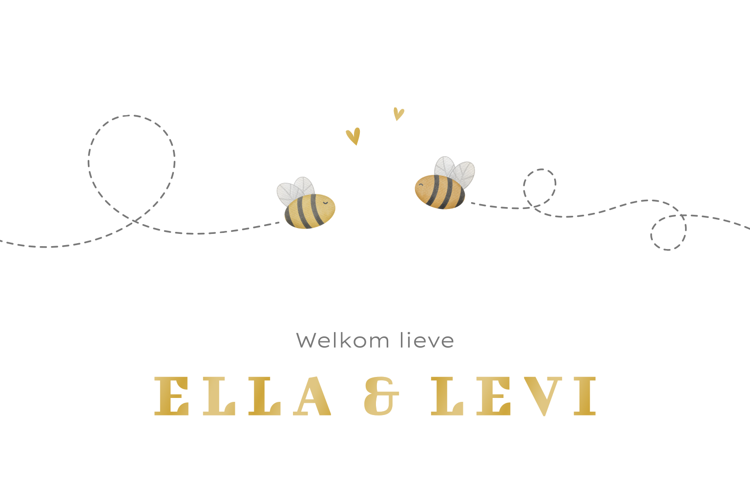 De lente komt eraan en dan zien we weer overal bloemen en bijtjes. Wil jij twee lieve bijtjes op het geboortekaartje van je tweeling? Dit ontwerp met schattige bijtjes en kleine hartjes kun je zelf nog verder bewerken in de editor. De naam van je twee kindjes staat in hoogglans net als de hartjes.