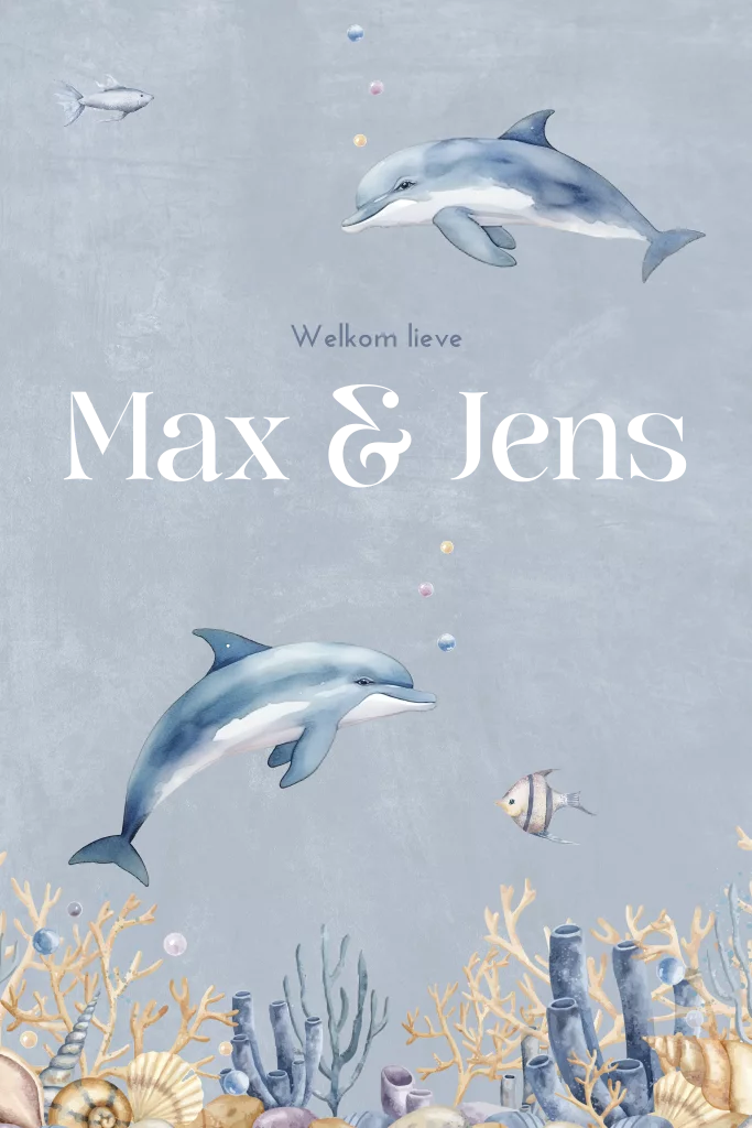 Is jullie babykamer een echte onderwaterwereld? Dan past dit geboortekaartje perfect bij jullie tweeling! Twee speelse dolfijnen omringen de namen van jullie zoontjes, gedrukt in goudfolie. Personaliseer het kaartje in onze online editor en bestel een proefdruk om het ontwerp eerst thuis te bewonderen.