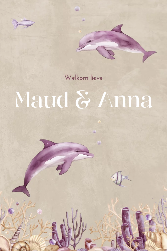 Is de kinderkamer omgetoverd tot een oceaan? Dan is dit geboortekaartje ideaal voor jullie tweeling meisjes! Vrolijke dolfijnen zwemmen rond de namen van jullie dochtertjes, prachtig gedrukt in goudfolie. Ontwerp het kaartje naar wens in onze online editor en bestel een proefdruk om het ontwerp thuis te bekijken.