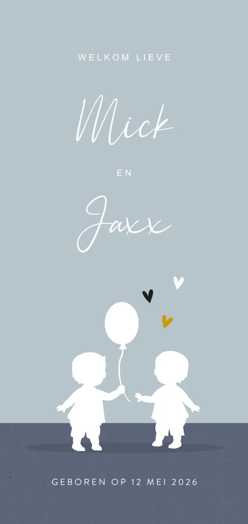 Tweeling silhouet geboortekaartje in grijsblauw voor jongens