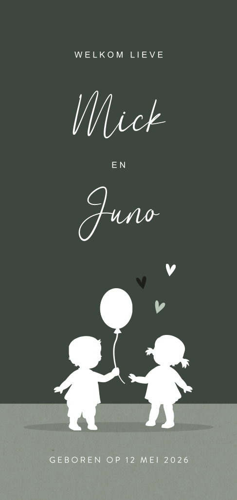 Een trendy ontwerp voor je tweeling! Op de voorkant van dit langwerpige kaartje staan twee silhouet kindjes, een jongetje met ballon en een meisje met staartjes in haar haren. Op de achterkant spelen de silhouetjes met een auto en beer. Lief, toch? De grijsgroene kleur maakt dit tot een eigentijds en vrolijk ontwerp. Toch liever een ander lettertype? Pas het kaartje gemakkelijk aan naar eigen inzicht. Op de achterzijde is naast alle info over je zoontje en dochtertje ook ruimte voor een lieve zin of quote.