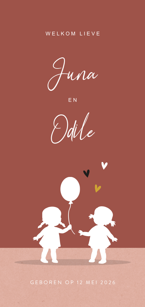 Silhouet geboortekaartjes zijn tijdloos! Zo ook dit leuke ontwerp met twee kleine silhouet meisjes voor je tweeling. Kondig hun komst aan met dit vrolijke kaartje in een mooie rozerode kleur. Op de achterkant komen de silhouetjes terug, spelend met een auto en een beertje. Op de voorkant heeft een van de kindjes een ballon vast. Het trendy lettertype maakt dit kaartje helemaal af.