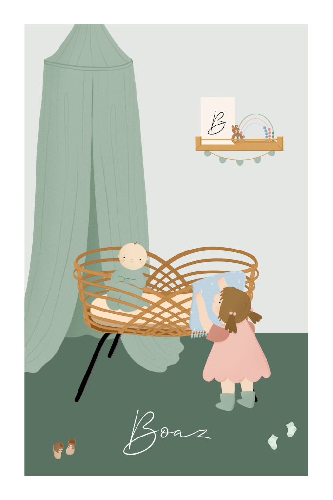 Geboortekaartje oudste zusje en baby jongen in groene kinderkamer. Is er een tweede kindje op komst? Dan is het natuurlijk leuk om het oudere zusje terug te laten komen op het geboortekaartje. Op dit lieve kaartje met kinderkamer staat de oudste dochter bij het rotan wiegje van haar baby broertje. De spulletjes in de kamer kun je zelf verschuiven of inwisselen voor andere afbeeldingen in onze ontwerptool. Kijk eens in de map 'Kinderkamer' voor de beschikbare illustraties in deze stijl.